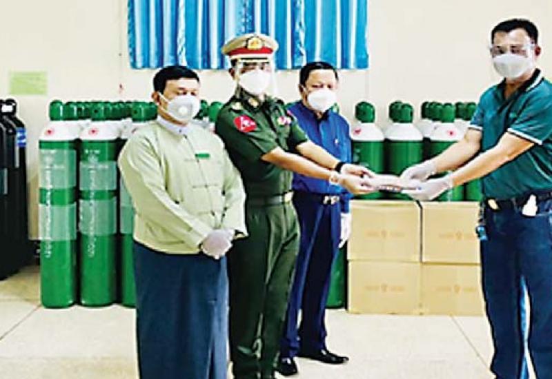 COVID-19 ရောဂါ ဓာတ်ခွဲအတည်ပြုပိုးတွေ့လူနာများကို ကုသရေးလုပ်ငန်းများ ဆောင်ရွက်ရာတွင် အောက်ဆီဂျင်လိုအပ်ချက်များကို တစ်ဖက်တစ်လမ်းမှ အထောက်အကူပြုစေရန်အတွက် တပ်မတော်အနေဖြင့် အောက်ဆီဂျင်အိုးများကို ဆေးရုံများနှင့် COVID-19 ရောဂါကုသရေးဌာနများ အရောက် သွားရောက်လှူဒါန်းလျက်ရှိသည်။