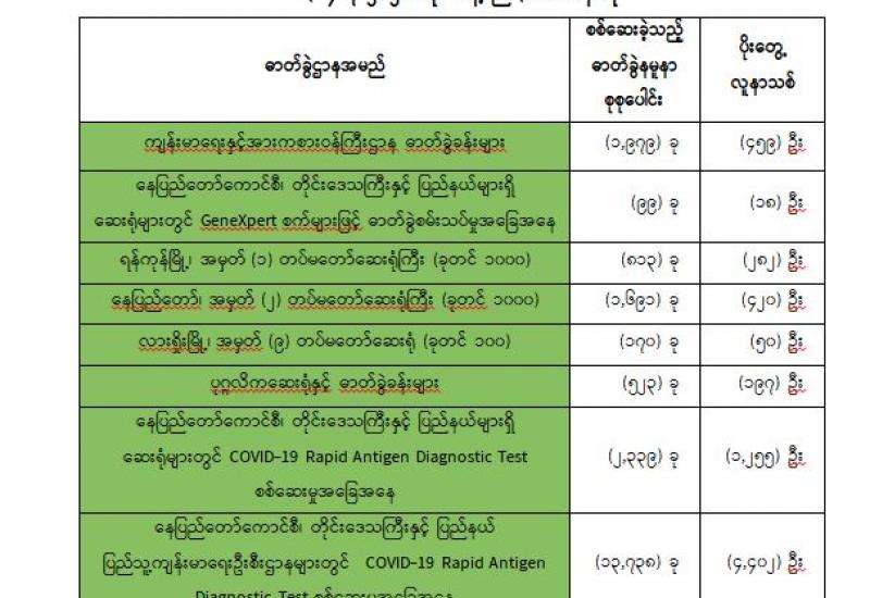 ကိုဗစ်-၁၉ ရောဂါ ဓာတ်ခွဲအတည်ပြု လူနာနှင့် ထိတွေ့ခဲ့သူများ၊ မိမိ ကိုယ်ကိုယ် ကိုဗစ်-၁၉ ရောဂါ သံသယရှိသူများ ကျန်းမာရေးစောင့် ရှောက်မှုခံယူနိုင်သည့်အစီအစဉ်များ ထုတ်ပြန်လိုက်ရာ ၎င်း အစီအစဉ်အရ ကိုဗစ်-၁၉ သံသယရှိပါက သက်ဆိုင်ရာ မြို့နယ်ဒေသန္တရ ကျန်းမာရေးဌာန သို့မဟုတ် မြို့နယ်ဆေးရုံများသို့ သွားရောက်သတင်း ပို့ရမည်ဖြစ်သည်။ မြို့နယ်တွင်သတင်းပို့သည့် သံသယ ရှိသူအား ဓာတ်ခွဲစစ်ဆေးပေးမည်ဖြစ်ပြီး ရောဂါပိုးတွေ့ရှိပါက ဓာတ်ခွဲအတည်ပြု လူနာများ အနေဖြင့် မိမိတို့၏ မြို့နယ်၊ တိုင်းဒေသကြီး၊ ပြည်နယ် ကျန်းမာရေးကော်မတီသို့ ပြန်လည် သတင်းပေးပို့ရမည်ဖြစ်သည်ဟု သိရသည်။