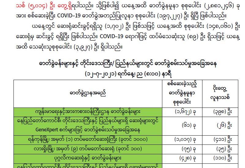 (၁၀-၇-၂၀၂၁) ရက်နေ့၊ ည (၈:၀၀) နာရီမှ (၁၁-၇-၂၀၂၁) ရက်နေ့၊ ည (၈:၀၀) နာရီအတွင်း ဓာတ်ခွဲနမူနာစုစုပေါင်း (၁၀,၁၁၇) ခုအား စစ်ဆေးပြီးစီးခဲ့ရာ COVID-19 ရောဂါ ဓာတ်ခွဲအတည်ပြု လူနာ သစ် (၃,၄၆၁) ဦး တွေ့ရှိရပါသည်။ သို့ဖြစ်ပါ၍ ယနေ့အထိ ဓာတ်ခွဲနမူနာ စုစုပေါင်း (၂,၈၆၆,၈၁၄) ခု အား စစ်ဆေးခဲ့ပြီး COVID-19 ဓာတ်ခွဲအတည်ပြုလူနာ စုစုပေါင်း (၁၉၂,၂၁၃) ဦး ရှိပြီ ဖြစ်ပါသည်။