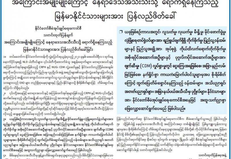 ကိုဗစ်-၁၉ ရောဂါ ကာကွယ်ရေးနှင့် ကုသရေးဆိုင်ရာ ဆေးဝါးနှင့် ဆေးကိရိယာပစ္စည်းများ တင်သွင်းခွင့် ရပ်ဆိုင်းခြင်းဟူသော ရုံးစာတစ်စောင် ဖေ့စ်ဘုတ်တွင် ပျံ့နှံ့နေခြင်းနှင့်အတူ ပြည်သူ လူထု အတွင်း၌လည်း စိုးရိမ်ထိတ်လန့်မှုနှင့် မကျေနပ်မှုများ ဖြစ်ပေါ်လာ ကြသည်။ ၎င်းစာအရ နှာခေါင်းစည်း၊ လက်အိတ်၊ PPE ဝတ်စုံ၊ အောက်ဆီဂျင်ဘူး၊ အောက်ဆီဂျင်စက် စသည်တို့ကို တင်သွင်းခွင့် ရပ်ဆိုင်းရန် ဟူ၍ ပါရှိရာ ကိုဗစ်-၁၉ တတိယလှိုင်း အရှိန်မြင့်တက် လာချိန်ဖြစ်သည့်အလျောက် ပြည်သူလူထုအတွင်း စိုးရိမ်ပူပန်မှုတို့ ဖြစ်လာရခြင်းဖြစ်သည်။ သို့ရာတွင် ဖေ့စ်ဘုတ်ပေါ်မှ အဆိုပါ ရုံးစာသည် အကုသာဖြစ်ပြီး ပြည်သူလူထုကို သတင်းအမှားပေးကာ ဆေးနှင့် ဆေးပစ္စည်းများ ဈေးကွက်တွင် ဈေးနှုန်းမြင့်တက်လာရေး နှင့်တစ်ပြိုင် တည်းမှာပင် နိုင်ငံရေးအမြတ် ထုတ်ရန်ကိုပါ ရည်ရွယ် သည့် ယုတ်ညံ့သော လုပ်ရပ်တစ်ခုပင် ဖြစ်သည်။