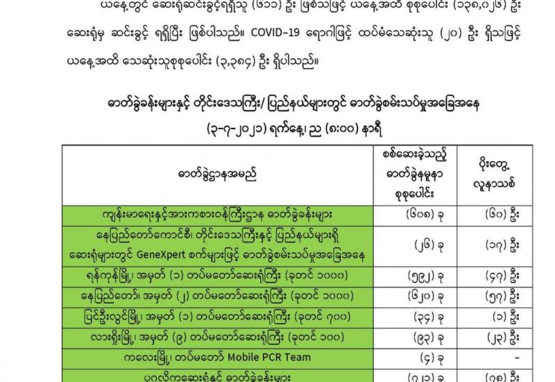 ပြည်သူလူထုအတွက် အဓိကအကျဆုံးဖြစ်သော ကျန်းမာရေးကဏ္ဍ မြင့်မားရေးအတွက် တပ်မတော်မှ ပါရဂူများ၊ ဆေးမှူးများ၊ သူနာပြု များဖြင့် ဝိုင်းဝန်းကူညီဆောင်ရွက်ပေးလျက် ရှိသည့်အပြင် ပြည်သူလူထု၏ အရေးပေါ် ကျန်းမာရေးဆိုင်ရာ ကုသမှုများ ဆောင်ရွက် ပေးနိုင်ရန်အတွက် တပ်မတော်ဆေးရုံများနှင့် ယာယီကုသရေးဆေးရုံများ၌ ကျန်းမာရေး စောင့်ရှောက်မှုများကို နေ့ညမပြတ် ဆောင်ရွက်ပေးလျက်ရှိရာ ဖေဖော်ဝါရီ ၅ ရက်မှယနေ့အထိ ပြင်ပလူနာပေါင်း ၂၆၅၁၀၀ ဦးနှင့် အတွင်းလူနာပေါင်း ၇၇၀၂၂ ဦးတို့ကို ကုသပေးနိုင်ခဲ့သည်။