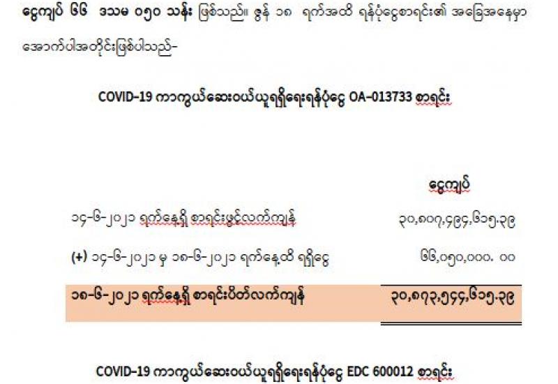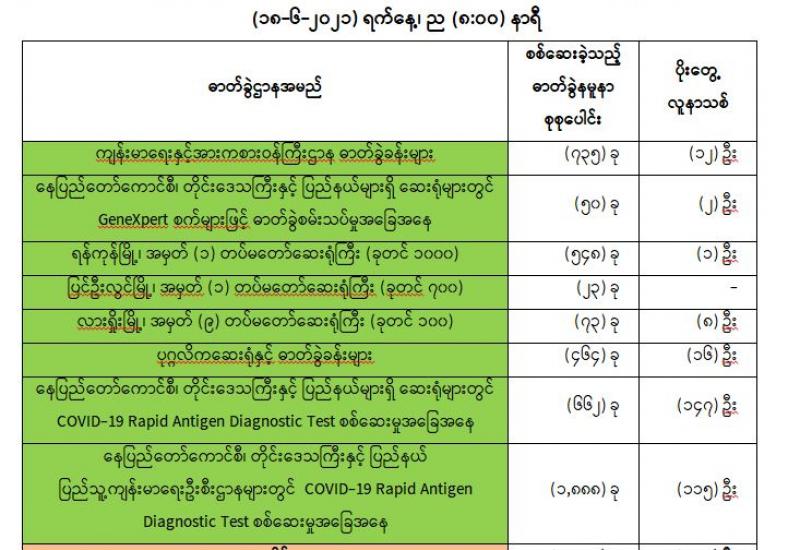 (၁၇-၆-၂၀၂၁) ရက်နေ့၊ ည (၈:၀၀) နာရီမှ (၁၈-၆-၂၀၂၁) ရက်နေ့၊ ည (၈:၀၀) နာရီအတွင်း ဓာတ်ခွဲနမူနာစုစုပေါင်း (၄.၄၄၃) ခုအား စစ်ဆေးပြီးစီးခဲ့ရာ COVID-19 ရောဂါ ဓာတ်ခွဲအတည်ပြု လူနာသစ် (၃၀၁) ဦး တွေ့ရှိရပါသည်။ သို့ဖြစ်ပါ၍ ယနေ့အထိ ဓာတ်ခွဲနမူနာ စုစုပေါင်း (၂,၆၆၆,၄၂၇) ခု အား စစ်ဆေးခဲ့ပြီး COVID-19 ဓာတ်ခွဲအတည်ပြုလူနာ စုစုပေါင်း (၁၄၇,၀၆၉) ဦး ရှိပြီ ဖြစ်ပါသည်။