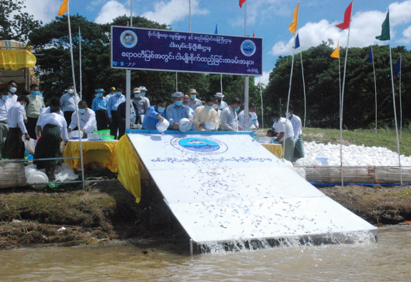 ဧရာဝတီမြစ်အတွင်း ငါးမျိုး စိုက်ထည့်ပွဲ အခမ်းအနားကို ဇွန် ၁၂ ရက် က စစ်ကိုင်းတံတားအနီး၌ ကျင်းပရာ စိုက်ပျိုးရေး၊မွေးမြူရေးနှင့် ဆည်မြောင်းဝန်ကြီးဌာန ဒုတိယဝန်ကြီး ဒေါက်တာအောင်ကြီး က ငါးမျိုးစိုက်ထည့်ပေးသည်။