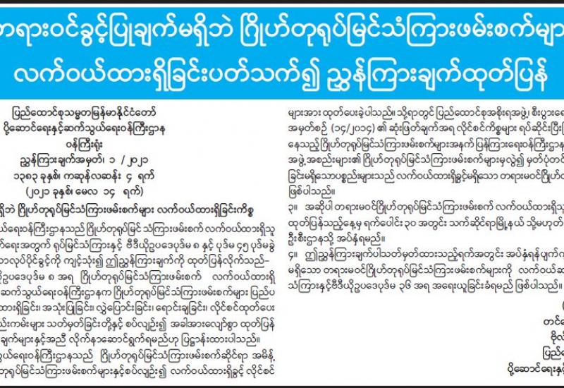 ပြန်ကြားရေးဝန်ကြီးဌာနက တာဝန်ယူစီမံခန့်ခွဲလျက်ရှိသော မန္တလေးမြို့ရှိ နိုင်ငံပိုင် ရုပ်ရှင်ရုံ လေးရုံနှင့် ပတ်သက်၍ တာဝန်နှင့်ဝတ္တရားများ လွှဲပြောင်းသည့်စာချုပ် (Deed of Assignment) ချုပ်ဆိုခြင်း အခမ်းအနားကို ယနေ့ညနေ ၅နာရီခွဲက မန္တလေးတိုင်းဒေသကြီး စီမံအုပ်ချုပ်ရေး ကောင်စီရုံး အစည်းအဝေး ခန်းမ၌ ကျင်းပသည်။