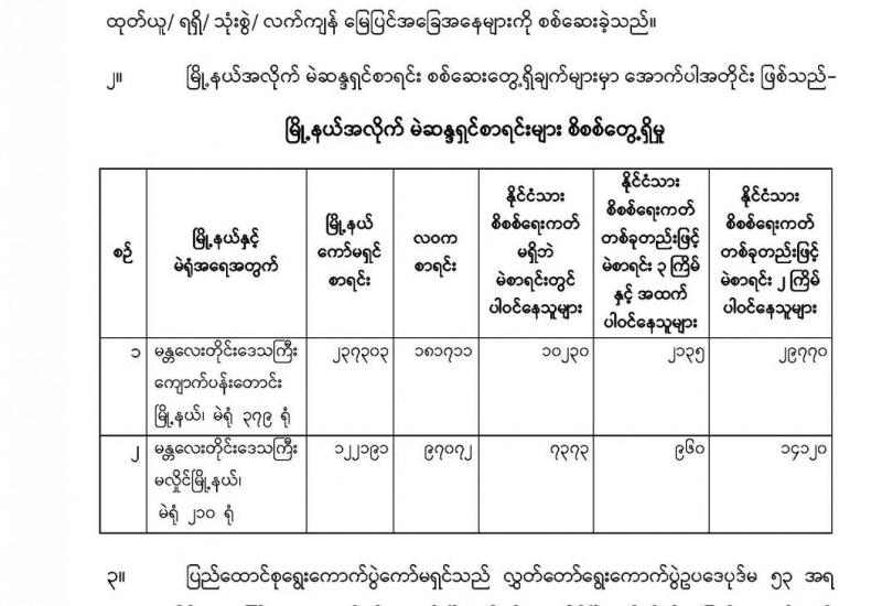 ၁၀။ ပြည်ထောင်စုရွေးကောက်ပွဲကော်မရှင် အဖွဲ့ဝင် ဦးခင်မောင်ဦးက ဆက်လက်ရှင်းလင်းရာ တွင် ၂၀၂၀ ပြည့်နှစ်အထွေထွေရွေးကောက်ပွဲတွင် သက်ဆိုင်ရာ မြို့နယ်ကော်မရှင်အဖွဲ့ခွဲများ အသုံး ပြုခဲ့သည့် နောက်ဆုံး မဲစာရင်း soft copy များကို ရယူပြီးနောက် ပြည်ထောင်စုရွေးကောက်ပွဲကော် မရှင်က စိစစ်ထုတ်ပြန်လျက်ရှိရာ ၂၀၂၁ ခုနှစ်၊ ဖေဖော်ဝါရီလ ၁၆ ရက်နေ့မှ ဧပြီလ ၈ ရက်နေ့အထိ ထုတ်ပြန်ပြီးစီးမှုများအရ တိုင်းဒေသကြီး/ပြည်နယ် နှင့် ပြည်ထောင်စုနယ်မြေ ၁၁ ခုရှိ မြို့နယ်ပေါင်း ၁၀၆ မြို့ နယ်၊ မဲရုံပေါင်း ၁၄၂၁၄ ရုံကို စိစစ်ခဲ့ရာ မြို့နယ်ကော်မရှင် စာရင်းအရ မဲဆန္ဒရှင် ၁၄၄၈၅၃၃၀ ဦးဖြစ်သော်လည်း လဝကစာရင်းအရ ၁၁၁၁၁၈၁၆ ဦးသာရှိပြီး ၃၃၇၃၅၁၄ ဦးကွာခြားမှု ရှိကြောင်း၊ ၎င်းတို့အနက်နိုင်ငံသားစိစစ်ရေးကတ်မရှိဘဲ မဲစာရင်းတွင် ပါဝင်နေသူ ၁၅၅၄၁၅၇ ဦး နိုင်ငံသားစိစစ်ရေး ကတ်တစ်ခုတည်းဖြင့် မဲစာရင်း ၃ ကြိမ်နှင့်အထက်ပါဝင်နေသူ ၁၁၁၂၃၉ ဦး နိုင်ငံသားစိစစ်ရေးကတ် တစ်ခုတည်းဖြင့် မဲစာရင်း ၂ ကြိမ်ပါဝင်သူ ၁၁၁၈၇၈၇ ဦး၊ စိစစ်ရေးကတ်မရှိဘဲ မဲစာရင်းတွင် ပါဝင်နေသူနှင့် မဲစာရင်းထပ်နေသူ စုစုပေါင်း ၂၇၈၄၁၈၃ ဦးရှိသည်ကို တွေ့ရှိရပြီး ရာခိုင်နှုန်းအားဖြင့် မဲဆန္ဒရှင်၏ ၁၉ ဒသမ ၂ ရာခိုင်နှုန်းဖြစ်ကြောင်း၊ ယခုစစ်ဆေးထုတ်ပြန်မှုများ သည် မြို့နယ်တစ်ခုချင်းအလိုက် စိစစ်တွေ့ရှိမှုများ သာဖြစ်ပြီး အခြားတိုင်းဒေသကြီး/ ခရိုင်/မြို့နယ် များနှင့် တိုက်ဆိုင်စစ်ဆေးမှု (Cross Check) များ ပါဝင်ပါက တပ်မတော်သတင်းမှန် ပြန်ကြားရေးအဖွဲ့ က မြို့နယ် ၃၁၅ မြို့နယ်၏ မဲစာရင်း CD PDF များကို အခြေခံထုတ်ပြန်ခဲ့သည့် မဲမသမာမှု ပြုနိုင်/ ဖြစ်နိုင်သည့် အရေအတွက် ၁၀၄၈၂၁၁၆ ဦး ရာခိုင် နှုန်း ၂၈ ဒသမ ၁၇ ရာခိုင်နှုန်းထက် ပိုမိုများပြားနိုင် သည်ကို စိစစ်တွေ့ရှိရပါကြောင်း ဖော်ပြပါ မြို့နယ် ၁၀၆ မြို့နယ်၏ မဲဆန္ဒရှင်စာရင်းများအပေါ် တပ်မတော် စိစစ်ချက်များနှင့် ပြည်ထောင်စုရွေးကောက်ပွဲကော်မရှင်၏ စိစစ် တွေ့ရှိချက်များကို နှိုင်းယှဉ်ရာတွင်လည်း စိစစ်သည့် အခြေခံမဲဆန္ဒရှင် စာရင်း ကွာခြားချက်အရ ကော်မရှင်၏ စိစစ်တွေ့ရှိ မှု အရေအတွက်ကကိုင်ဆောင်လက်မှတ်တစ်မျိုးမျိုး (မှတ်ပုံတင်) မရှိဘဲ မဲစာရင်းတွင် ပါဝင်နေသူ ၆၃၉၂၇ ဦး၊ တစ်ကြိမ်ထက်ပို၍ မဲစာရင်းတွင် ပါဝင် သူ (ထပ်နေသော မဲစာရင်း) ၃၅၈၀၁၈ ဦး ပိုမို စိစစ်တွေ့ရှိရပါကြောင်း၊ ယခုဆက်လက်ပြီး ၂ဝ၂ဝ ပြည့်နှစ် အထွေထွေရွေးကောက်ပွဲတွင် အသုံးပြုခဲ့သည့် ဆန္ဒမဲလက်မှတ်များကို မြေပြင်ကွင်းဆင်းစစ်ဆေးပြီး ထုတ်ပြန်လျက်ရှိမှု အခြေ အနေများကို တင်ပြမှာဖြစ်ပါကြောင်း၊ ပြည်ထော င်စုရွေးကောက်ပွဲကော်မရှင် အနေဖြင့် ၂၀၂၁ ခုနှစ်၊ ဖေဖော်ဝါရီလ ၂၄ ရက်နေ့မှ