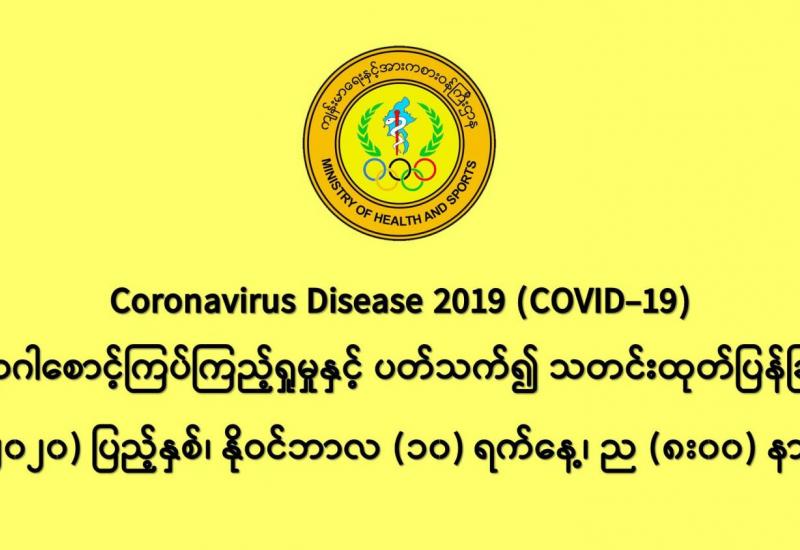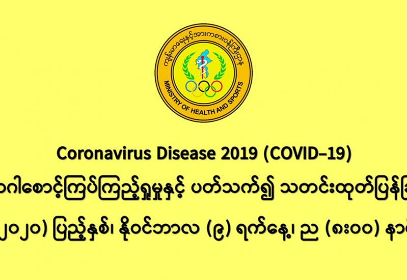 (၈-၁၁-၂၀၂၀) ရက်နေ့၊ ည (၈:၀၀) နာရီမှ (၉-၁၁-၂၀၂၀) ရက်နေ့၊ ည (၈:၀၀) နာရီအတွင်း ဓာတ်ခွဲနမူနာ စုစုပေါင်း (၉,၂၃၀) ခုအား စစ်ဆေးပြီးစီးခဲ့ရာ COVID-19 ရောဂါ ဓာတ်ခွဲအတည်ပြု လူနာသစ်(၅၉၈) ဦး တွေ့ရှိရပါသည်။