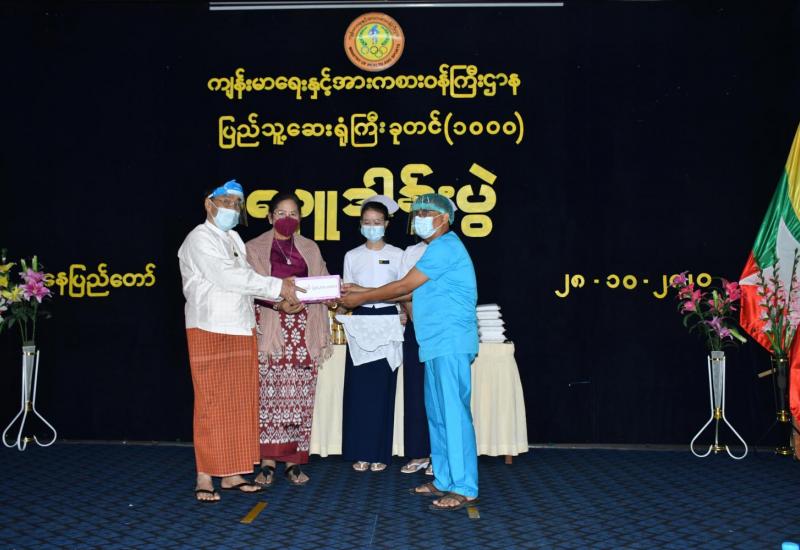 တိုင်းရင်းသားလူမျိုးများရေးရာ ဝန်ကြီးဌာန မိသားစုတို့က ငွေကျပ်သိန်း (၃၀) တန်ဖိုးရှိ ရေခဲသေတ္တာ(၁)လုံးနှင့် လေအေးပေးစက် (၄)လုံးတို့ကို နေပြည်တော် ပြည်သူ့ဆေးရုံကြီး (ခုတင်-၁၀၀၀)ရှိ COVID-19 ICU အခန်းအတွက်နှင့် နေပြည်တော် ပြည်သူ့ဆေးရုံကြီး (ခုတင်-၁၀၀၀)၊ နေပြည်တော် ပြည်သူ့ဆေးရုံကြီး (ခုတင်-၃၀၀)၊ မျက်စိ၊ နား၊ နှာခေါင်း၊ လည်ချောင်း၊ ဦးခေါင်းနှင့် လည်ပင်းခွဲစိတ်အထူးကုဆေးရုံကြီးနှင့် သွားရောဂါအထူးကုဆေးရုံကြီးတို့၌ တာဝန်ထမ်းဆောင် လျက်ရှိသော ကျန်းမာရေးဝန်ထမ်းများနှင့် လူနာများအတွက် စိန်ဟင်္သာ ရိပ်မွန်ကုမ္ပဏီလီမိတက်မှ ထုတ်လုပ်သော ငွေကျပ် (၃၃) သိန်းခန့် တန်ဖိုးရှိ ထမင်းဘူးနှင့် စည်သွပ်ဘူးများ ပေးအပ် လှူဒါန်းခြင်း အခမ်းအနားကို ယမန်နေ့ နံနက်ပိုင်းက နေပြည်တော် ပြည်သူ့ဆေးရုံကြီး (ခုတင်-၁၀၀၀)ရှိ အစည်းအဝေးခ န်းမဆောင်-၂ ၌ ကျင်းပပြုလုပ်သည်။