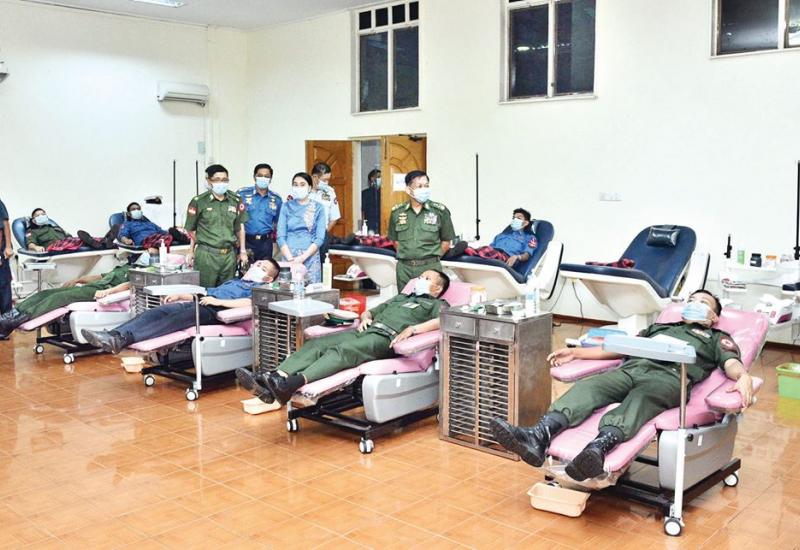 ရန်ကုန်တိုင်းစစ်ဌာနချုပ်နယ်မြေအတွင်းရှိ တပ်မတော် (ကြည်း၊ ရေ၊ လေ) မှ အရာရှိ၊ စစ်သည်များက ရန်ကုန်တိုင်းဒေသကြီး လသာမြို့နယ်ရှိ ကျန်းမာရေးနှင့် အားကစားဝန်ကြီးဌာန အမျိုးသားသွေးဌာန (ရန်ကုန်) ၌ ယနေ့နံနက်ပိုင်းတွင် စုပေါင်းသွေးလှူဒါန်းကြရာ တပ်မတော်ကာကွယ်ရေးဦးစီးချုပ် ဗိုလ်ချုပ် မှူးကြီး မင်းအောင်လှိုင်နှင့် တပ်မတော်အရာရှိကြီးများက သွားရောက်ကြည့်ရှု အားပေးကြသည်။