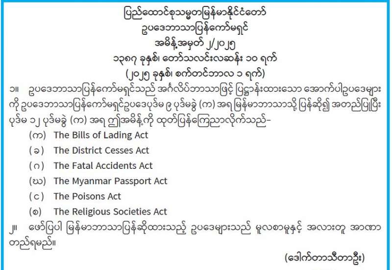 အင်္ဂလိပ်ဘာသာဖြင့် ပြဋ္ဌာန်းထားသောဥပဒေများ မြန်မာဘာသာသို့ ပြန်ဆိုအတည်ပြု