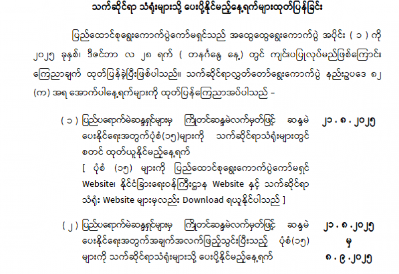 ရွေးကောက်ပွဲဆိုင်ရာ စွမ်းရည်မြှင့်သင်တန်း သင်တန်းဆင်းပွဲအခမ်းအနားကို ယနေ့ညနေ ၄ နာရီတွင် ပြည်ထောင်စုရွေးကောက်ပွဲကော်မရှင်ရုံး တိုးချဲ့ရုံး အဆောက်အအုံ၌ ကျင်းပပြုလုပ်သည်။