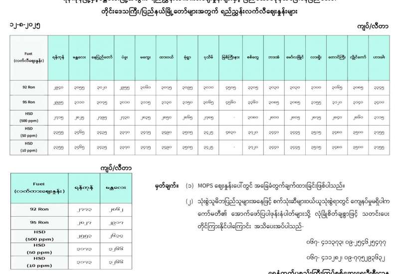 ရန်ကုန်မြို့နှင့် မန္တလေးမြို့အတွက် ရည်ညွှန်းလက်ကားဈေးနှုန်းများနှင့် ပြည်ထောင်စုနယ်မြေ နေပြည်တော်၊ တိုင်းဒေသကြီး/ပြည်နယ် မြို့တော်များအတွက် ရည်ညွှန်းလက်လီဈေးနှုန်းများ