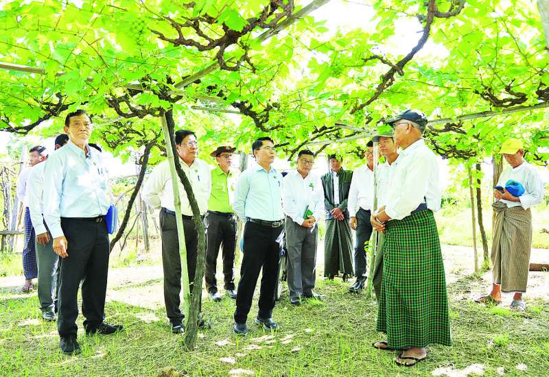 စိုက်ပျိုးရေး၊ မွေးမြူရေးနှင့်ဆည်မြောင်းဝန်ကြီးဌာန ပြည်ထောင်စုဝန်ကြီး ဦးမင်းနောင်သည် ယနေ့နံနက်ပိုင်းတွင် မန္တလေးတိုင်းဒေသကြီး ရမည်းသင်းမြို့နယ် ရွာတန်းကျေးရွာအုပ်စုရှိ စပျစ်စိုက်ခင်းများကို ကွင်းဆင်းကြည့်ရှုစစ်ဆေးပြီး ဒေသခံတောင်သူများနှင့် တွေ့ဆုံသည်။