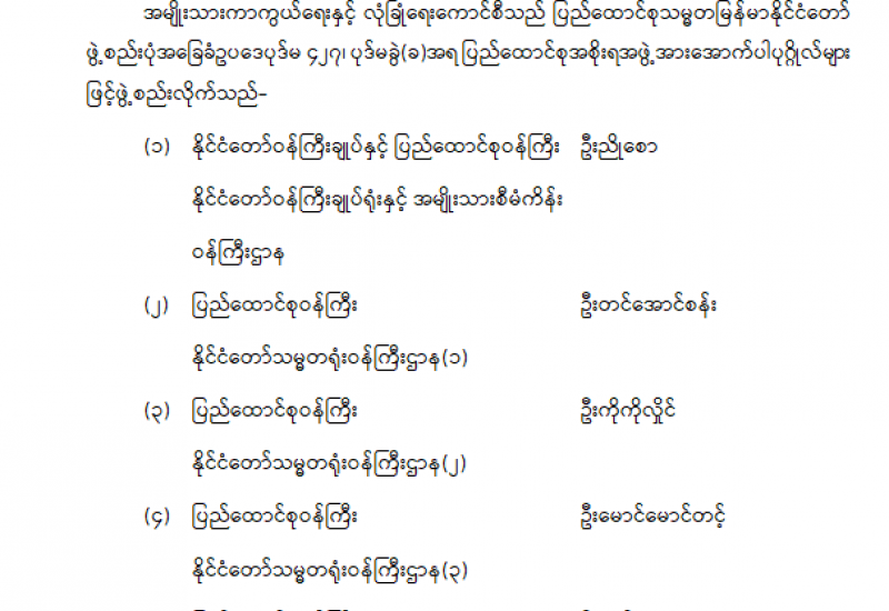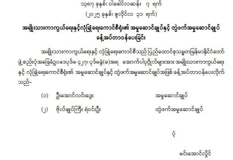 ပြည်ထောင်စုရာထူးဝန်အဖွဲ့ ဥက္ကဋ္ဌနှင့် အဖွဲ့ဝင်များ ခန့်အပ်တာဝန်ပေးခြင်း