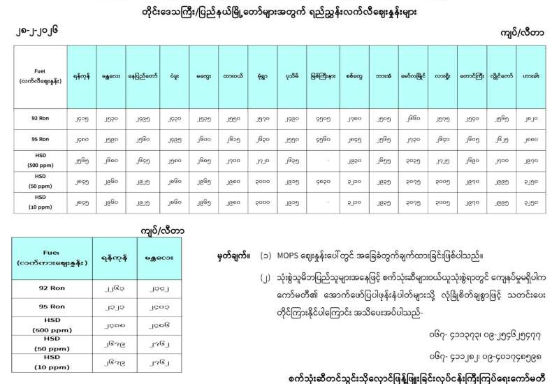ရန်ကုန်မြို့နှင့် မန္တလေးမြို့အတွက် ရည်ညွှန်းလက်ကားဈေးနှုန်းများနှင့် ပြည်ထောင်စုနယ်မြေ နေပြည်တော်၊ တိုင်းဒေသကြီး/ပြည်နယ် မြို့တော်များအတွက် ရည်ညွှန်းလက်လီဈေးနှုန်းများ
