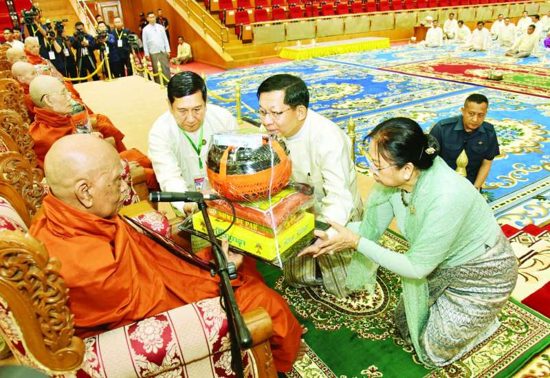 ၂၀၂၆ ခုနှစ်၊ သာသနာတော်ဆိုင်ရာ ဘွဲ့တံဆိပ်တော် ဆက်ကပ်ခံယူတော်မူမည့် ဆရာတော်ကြီးများအား နေ့ဆွမ်းဆက်ကပ်လှူဒါန်းခြင်းကို ယနေ့နံနက်ပိုင်းတွင် နေပြည်တော်၊ မာရဝိဇယဗုဒ္ဓဥယျာဉ်တော်ပရိဝုဏ်အတွင်းရှိ အဂ္ဂါဓိပတိသာသနာ့ဗိမာန်တော်ကြီး၌ ကျင်းပရာ ပြည်ထောင်စုသမ္မတမြန်မာနိုင်ငံတော်ယာယီသမ္မတ နိုင်ငံတော်လုံခြုံရေးနှင့်အေးချမ်းသာယာရေးကော်မရှင်ဥက္ကဋ္ဌ ဗိုလ်ချုပ်မှူးကြီး မင်းအောင်လှိုင်နှင့် ဇနီး ဒေါ်ကြူကြူလှတို့ တက်ရောက်၍ နေ့ဆွမ်းဆက်ကပ်လှူဒါန်းသည်။