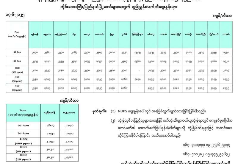 ရန်ကုန်မြို့နှင့် မန္တလေးမြို့အတွက် ရည်ညွှန်းလက်ကားဈေးနှုန်းများနှင့် ပြည်ထောင်စုနယ်မြေ နေပြည်တော်၊ တိုင်းဒေသကြီး/ပြည်နယ် မြို့တော်များအတွက် ရည်ညွှန်းလက်လီဈေးနှုန်းများ
