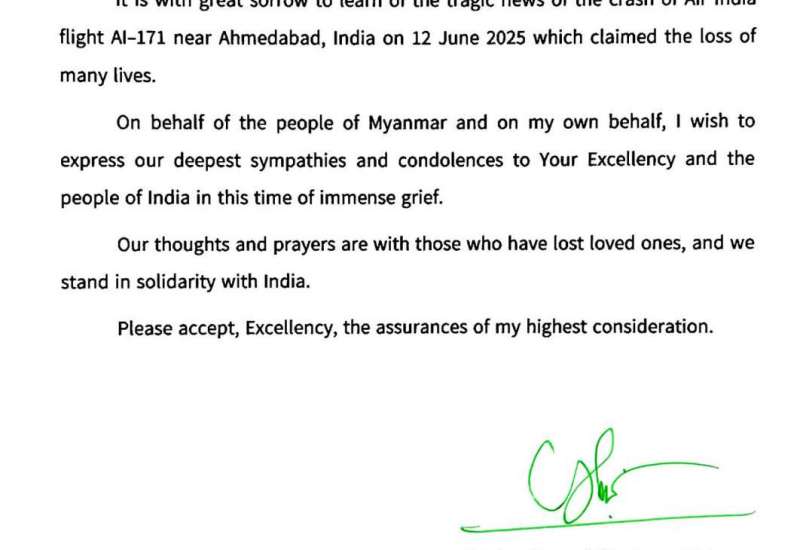 နိုင်ငံတော်စီမံအုပ်ချုပ်ရေးကောင်စီဥက္ကဋ္ဌ နိုင်ငံတော်ဝန်ကြီးချုပ် ဗိုလ်ချုပ်မှူးကြီး မင်းအောင်လှိုင်သည် ယနေ့တွင် အိန္ဒိယသမ္မတနိုင်ငံ အမီဒါဘတ်မြို့အနီး၌ အိန္ဒိယလေကြောင်း AI-171 ပျက်ကျခဲ့မှုကြောင့် လူပေါင်းများစွာ အသက်ဆုံးရှုံးခဲ့ရမှုများအတွက် ဝမ်းနည်းကြောင်းသဝဏ်လွှာကို အိန္ဒိယသမ္မတနိုင်ငံ ဝန်ကြီးချုပ် ရှရီ နာရန်ဒရာ မိုဒီ ထံသို့ ပေးပို့သည်။