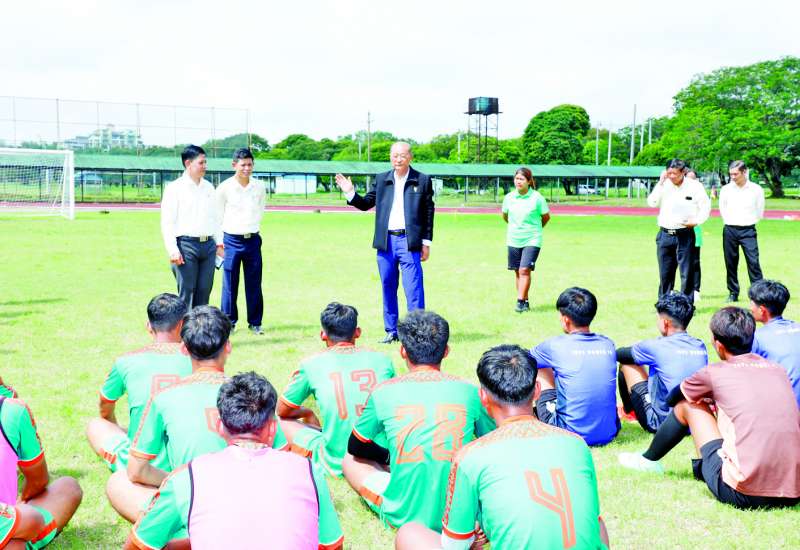 မြန်မာနိုင်ငံအိုလံပစ်ကော်မတီဥက္ကဋ္ဌ အားကစားနှင့် လူငယ်ရေးရာဝန်ကြီးဌာန ပြည်ထောင်စုဝန်ကြီး Jeng Phang နော်တောင်သည် ယနေ့နံနက် ၇ နာရီခွဲတွင် ရန်ကုန်မြို့ တာမွေမြို့နယ် ကျိုက္ကဆံကွင်းအတွင်းရှိ ဘောလုံးကွင်းအမှတ်(၁)၌ Myanmar National League 2025-2026 I.S.P.E FC အမျိုးသားဘောလုံးအသင်းနှင့် Myanmar Women League 2025-2026 I.S.P.E FC အမျိုးသမီးဘောလုံးအသင်းတို့၏ လေ့ကျင့်နေမှုကို ကြည့်ရှုအားပေးသည်။