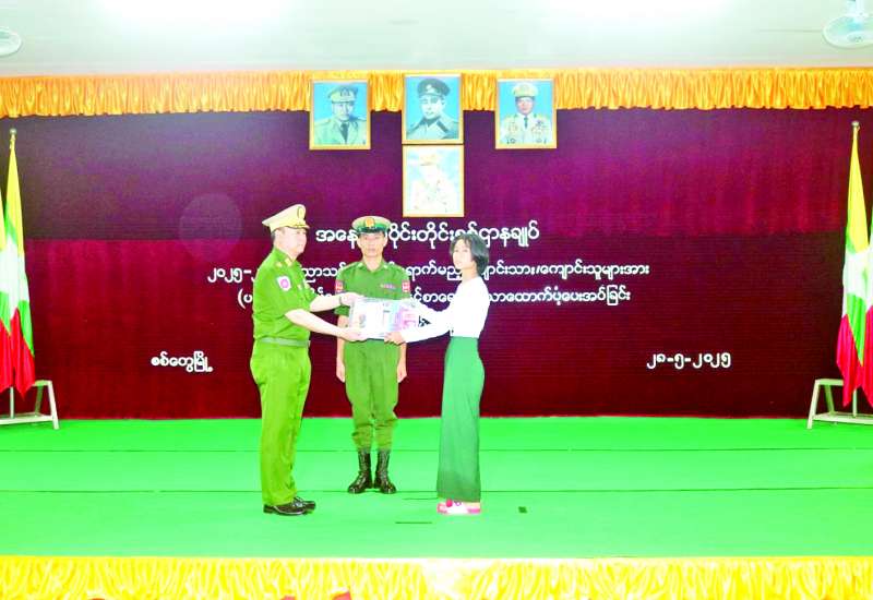 ၂၀၂၅-၂၀၂၆ ပညာသင်နှစ် အခြေခံပညာကျောင်းများတွင် တက်ရောက်ပညာသင်ကြားကြမည့် အနောက်ပိုင်းတိုင်းစစ်ဌာနချုပ်ရှိ တပ်မတော်သားမိသားစုဝင် ကျောင်းသား ကျောင်းသူများအား ကျောင်းဝတ်စုံနှင့် စာရေးကိရိယာများ ပထမအကြိမ် ပေးအပ်ခြင်းကို ယနေ့နံနက်ပိုင်းတွင် စစ်တွေတပ်နယ်ခန်းမ၌ ပြုလုပ်ရာ တိုင်းမှူး ဗိုလ်ချုပ် ကျော်စွာဦးနှင့် အရာရှိ၊ စစ်သည်၊ မိသားစုများ၊ ကျောင်းသား ကျောင်းသူများ တက်ရောက်ကြသည်။