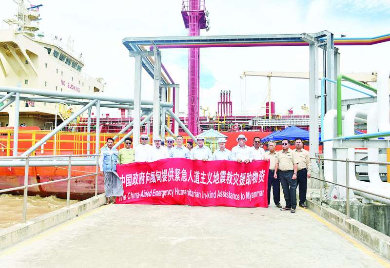 မန္တလေးငလျင်ကြီးကြောင့် ပြန်လည်ထူထောင်ရေးလုပ်ငန်းများတွင်အသုံးပြုရန် တရုတ်ပြည်သူ့သမ္မတနိုင်ငံမှ (၁၅) ကြိမ်မြောက် လှူဒါန်းသည့် အောက်တိန်း(92) ၂၉၄၀ ဒသမ ၀၅၅ တန်၊ ဒီဇယ် ၁၁၉၃၀ ဒသမ ၅၀၅ တန် တင်ဆောင်လာသော MT YU DONG သင်္ဘောသည် မေ ၂၃ ရက် နံနက် ၂ နာရီခွဲက သန်လျင်ခရိုင် ကျောက်တန်းမြို့နယ် BRIGHTER ENERGY ဆီလှောင်ဆိပ်ကမ်းသို့လည်းကောင်း၊ (၁၆) ကြိမ်မြောက်လှူဒါန်းသည့် Modular (prefa-bricated) house အလုံး ၁၁၂၀၊ Offices အလုံး ၁၆၀ တင်ဆောင်လာသော MV. Orient Glory သင်္ဘောသည် ယမန်နေ့ညနေ ၄ နာရီက သီလဝါ (MITT) ဆိပ်ကမ်းသို့လည်းကောင်း ရောက်ရှိခဲ့ကြသည်။