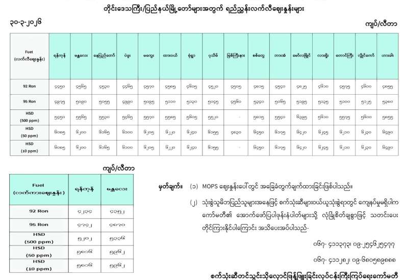 ရန်ကုန်မြို့နှင့် မန္တလေးမြို့အတွက် ရည်ညွှန်းလက်ကားဈေးနှုန်းများနှင့် ပြည်ထောင်စုနယ်မြေ နေပြည်တော်၊ တိုင်းဒေသကြီး / ပြည်နယ် မြို့တော်များအတွက် ရည်ညွှန်းလက်လီဈေးနှုန်းများ