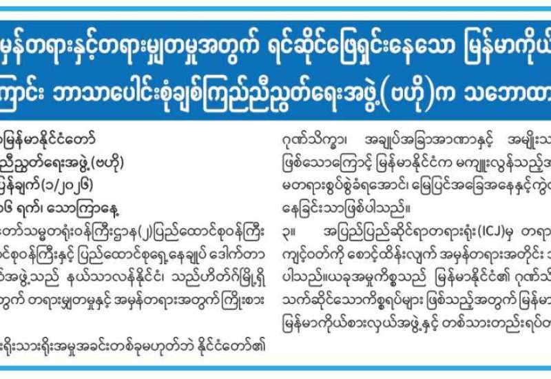 မြန်မာနိုင်ငံ၏ အမှန်တရားနှင့်တရားမျှတမှုအတွက် ရင်ဆိုင်ဖြေရှင်းနေသော မြန်မာကိုယ်စားလှယ်အဖွဲ့နှင့် တစ်သားတည်းရပ်တည်လျက်ရှိကြောင်း ဘာသာပေါင်းစုံချစ်ကြည်ညီညွတ်ရေးအဖွဲ့ (ဗဟို) က သဘောထားထုတ်ပြန်ချက်ထုတ်ပြန်ကြေညာ