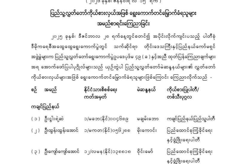 ပြည်သူ့လွှတ်တော်ကိုယ်စားလှယ်အဖြစ် ရွေးကောက်တင်မြှောက်ခံရသူများ အမည်စာရင်းကြေညာခြင်း