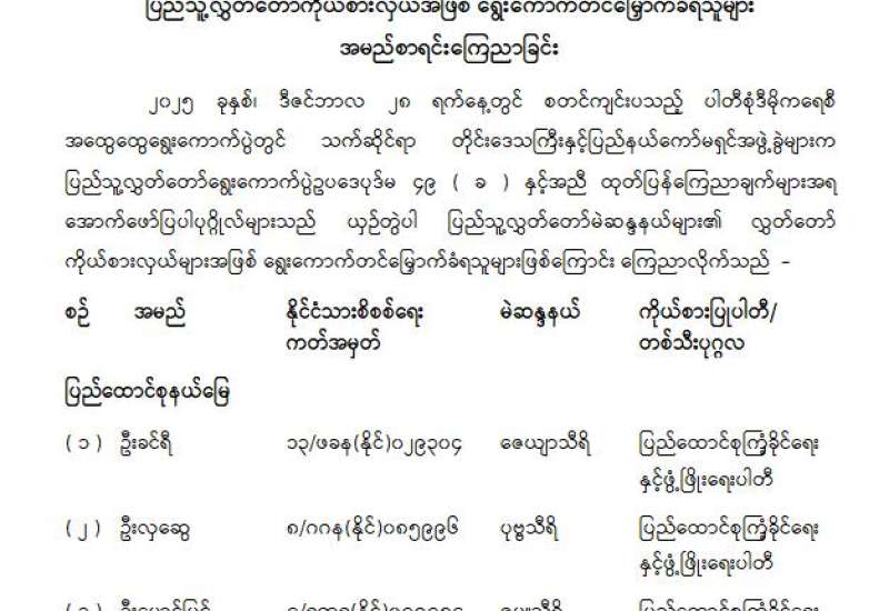 ပြည်သူ့လွှတ်တော်ကိုယ်စားလှယ်အဖြစ် ရွေးကောက်တင်မြှောက်ခံရသူများ အမည်စာရင်း ကြေညာခြင်း