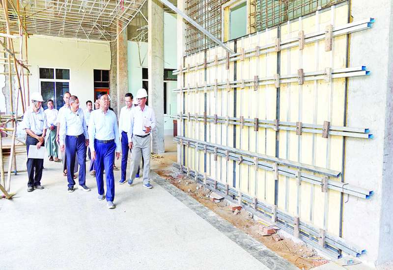 အဆောက်အအုံများ ပြန်လည်ပြုပြင်အသုံးပြုရေးနှင့် အသစ်တည်ဆောက်ရေး ကြီးကြပ်မှုကော်မတီဥက္ကဋ္ဌ ဆောက်လုပ်ရေးဝန်ကြီးဌာန ပြည်ထောင်စုဝန်ကြီး ဦးမျိုးသန့်သည် ဒုတိယဝန်ကြီး ဦးမျိုးမြင့်၊ နေပြည်တော်ကောင်စီအဖွဲ့ဝင်များ၊ အမြဲတမ်းအတွင်းဝန်နှင့်အတူ ယနေ့တွင် နေပြည်တော်ကောင်စီနယ်မြေအတွင်း မန္တလေးငလျင်ကြီးကြောင့် ပျက်စီးသွားသည့် ဝန်ထမ်းအိမ်ရာများအတွက် လေးခန်းတွဲလေးထပ်အဆောက်အအုံများ အသစ်ပြန်လည်တည်ဆောက်နေမှုအခြေအနေ၊ ရုံးအဆောက်အအုံများ ပြုပြင်ဆောင်ရွက်နေသည့် အခြေအနေတို့ကို ကြည့်ရှုစစ်ဆေးသည်။