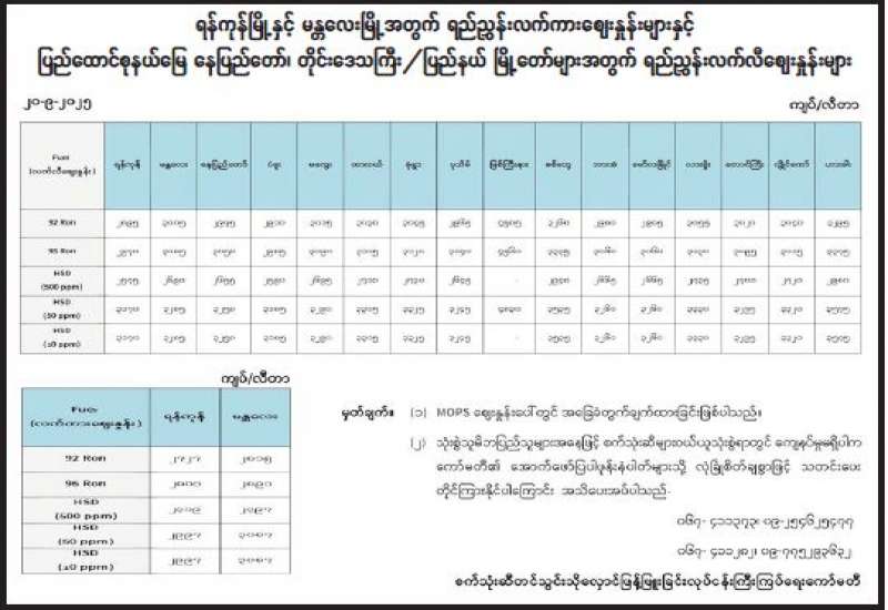 ရန်ကုန်မြို့နှင့် မန္တလေးမြို့အတွက် ရည်ညွှန်းလက်ကားဈေးနှုန်းများနှင့် ပြည်ထောင်စုနယ်မြေ နေပြည်တော်၊ တိုင်းဒေသကြီး/ပြည်နယ် မြို့တော်များအတွက် ရည်ညွှန်းလက်လီဈေးနှုန်းများ