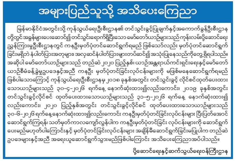 ပြောင်းလုပ်ငန်းရှင်များသို့ အသိပေးကြေညာချက်
