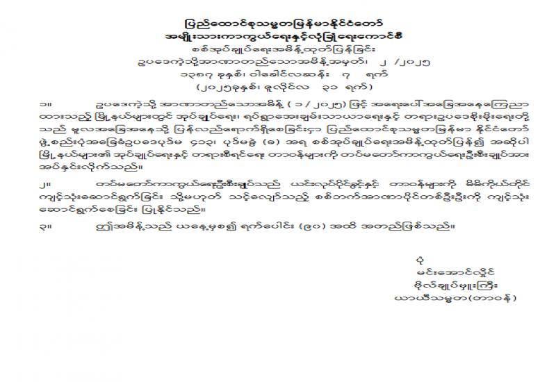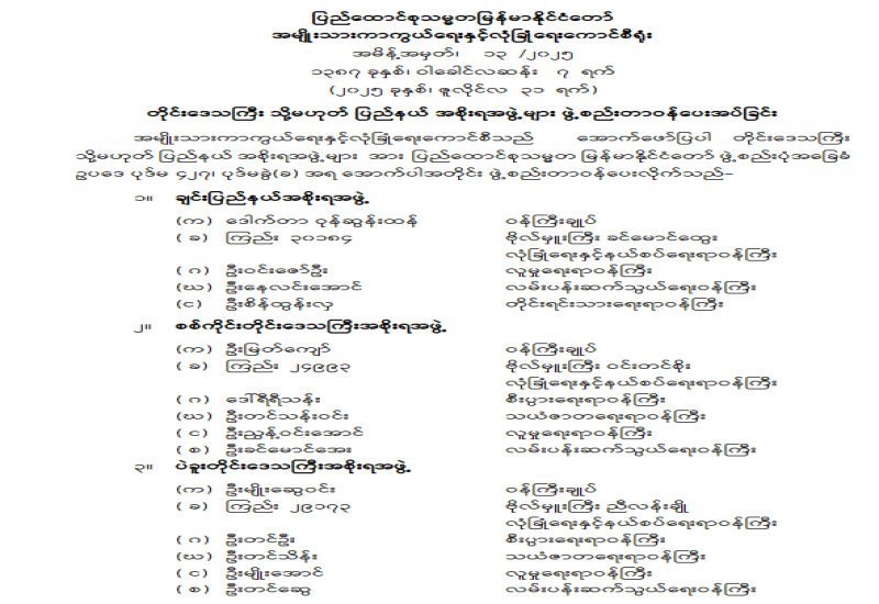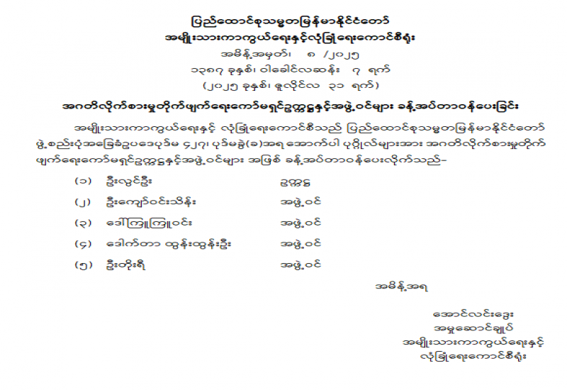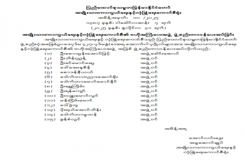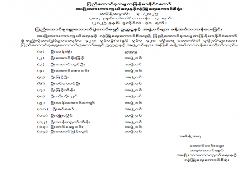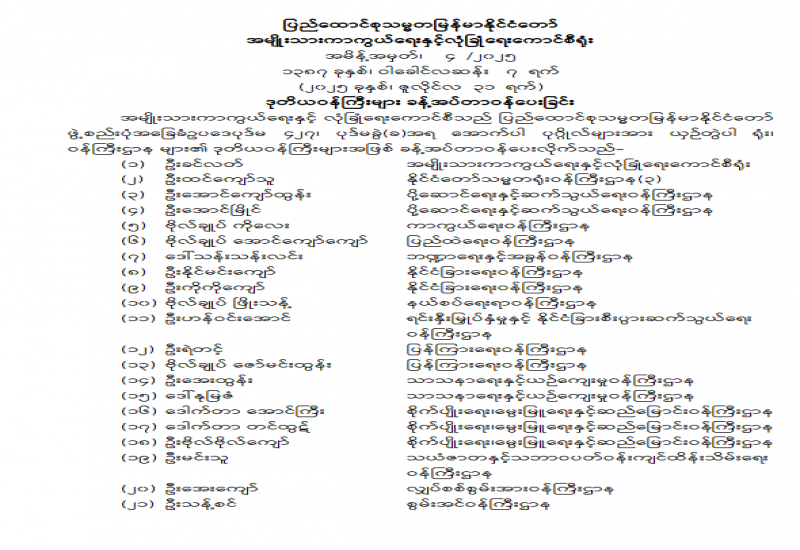 ပြည်ထောင်စုရာထူးဝန်အဖွဲ့ ဥက္ကဋ္ဌနှင့် အဖွဲ့ဝင်များ ခန့်အပ်တာဝန်ပေးခြင်း