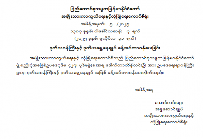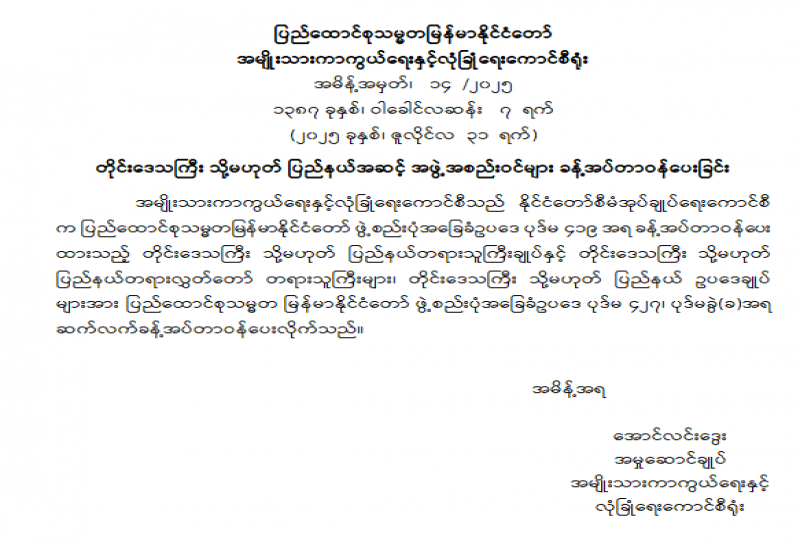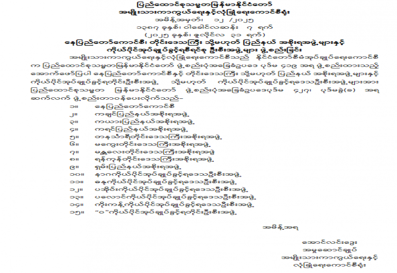 မြန်မာနိုင်ငံအမျိုးသားလူ့အခွင့်အရေးကော်မရှင်ဥက္ကဋ္ဌနှင့် အဖွဲ့ဝင်များ ခန့်အပ်တာဝန်ပေးခြင်း