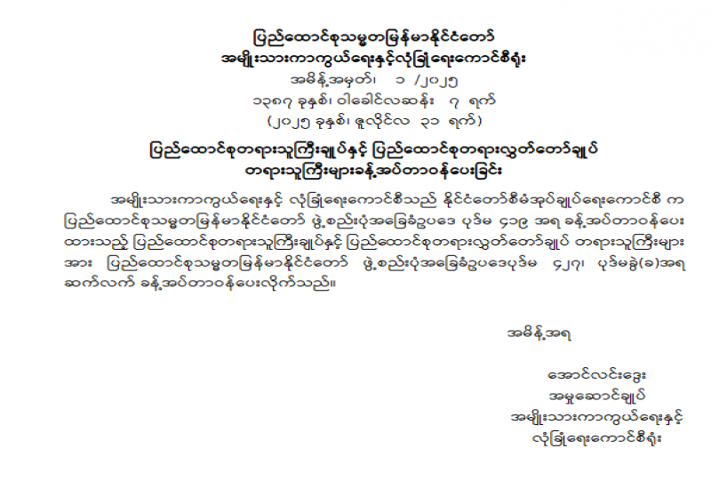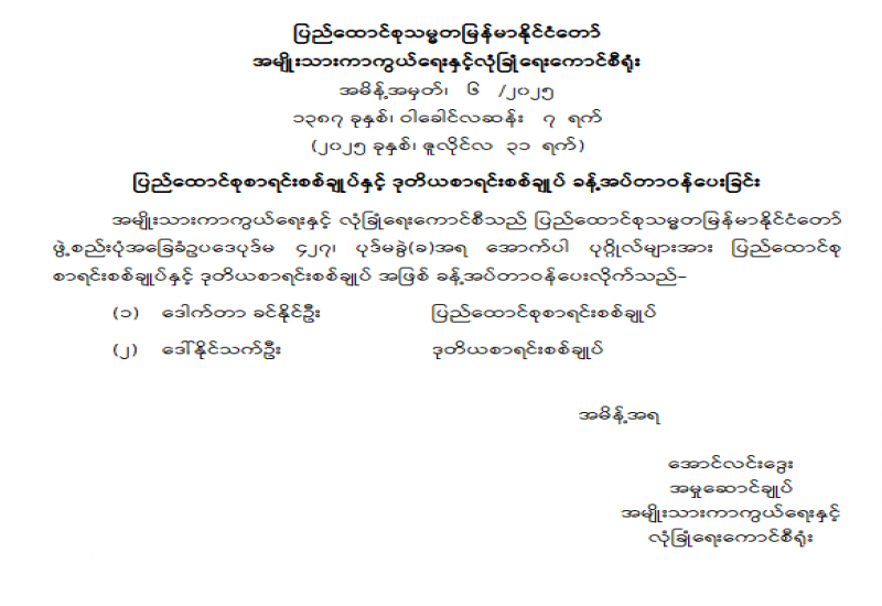 ပြည်ထောင်စုရွေးကောက်ပွဲကော်မရှင် ဥက္ကဋ္ဌနှင့် အဖွဲ့ဝင်များ ခန့်အပ်တာဝန်ပေးခြင်း