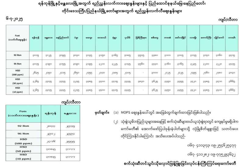 ရန်ကုန်မြို့နှင့် မန္တလေးမြို့အတွက် ရည်ညွှန်းလက်ကားဈေးနှုန်းများနှင့် ပြည်ထောင်စုနယ်မြေ နေပြည်တော်၊ တိုင်းဒေသကြီး/ပြည်နယ် မြို့တော်များအတွက် ရည်ညွှန်းလက်လီဈေးနှုန်းများ