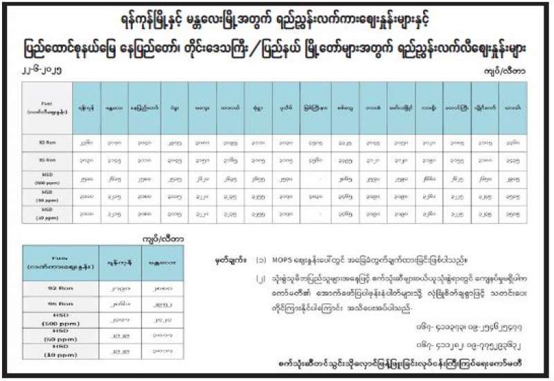 ရန်ကုန်မြို့နှင့် မန္တလေးမြို့အတွက် ရည်ညွှန်းလက်ကားဈေးနှုန်းများနှင့် ပြည်ထောင်စုနယ်မြေ နေပြည်တော်၊ တိုင်းဒေသကြီး/ ပြည်နယ် မြို့တော်များအတွက် ရည်ညွှန်းလက်လီဈေးနှုန်းများ