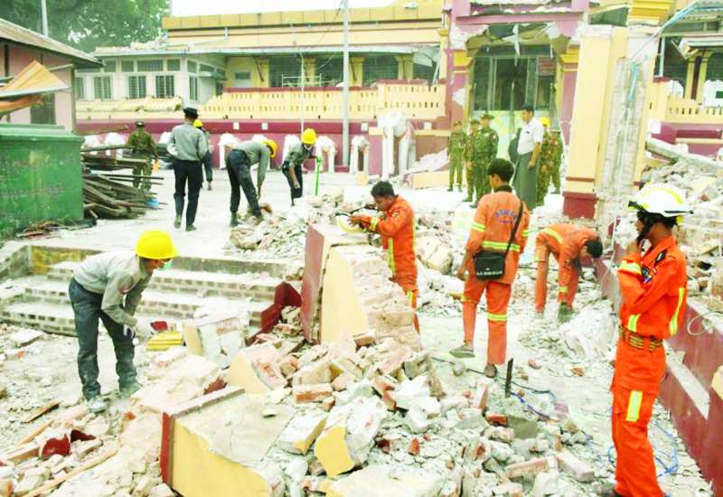 မြန်မာနိုင်ငံတွင် လှုပ်ခတ်ခဲ့သော မန္တလေးငလျင်ကြီးကြောင့် လမ်းတံတား၊ အဆောက်အအုံများ ထိခိုက်ပျက်စီးခဲ့ရသည့်နေရာများ၌ ကူညီကယ်ဆယ်ရေးနှင့် ပြန်လည်ထူထောင်ရေးလုပ်ငန်းများကို တိုင်းစစ်ဌာနချုပ်အသီးသီးမှ တပ်မတော်သားများ၊ မြန်မာနိုင်ငံရဲတပ်ဖွဲ့ဝင်များ၊ မီးသတ်တပ်ဖွဲ့ဝင်များ၊ ပြည်ပနိုင်ငံများမှ ကူညီကယ်ဆယ်ရေးအဖွဲ့များ၊ ဌာနဆိုင်ရာဝန်ထမ်းများ၊ လူမှုကူညီရေးအသင်း/အဖွဲ့များနှင့် ဒေသခံပြည်သူများပူးပေါင်း၍ အချိန်နှင့်တပြေးညီ ကူညီဆောင်ရွက်ပေးလျက်ရှိသည်။