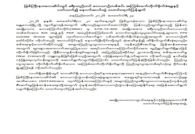 မြစ်ကြီးနားလေဆိပ်တွင် ခရီးသည်တင် လေယာဉ်တစ်စင်း အကြမ်းဖက်တိုက်ခိုက်ခံရမှုနှင့် ပတ်သက်၍ နောက်ဆက်တွဲ သတင်းထုတ်ပြန်ချက်