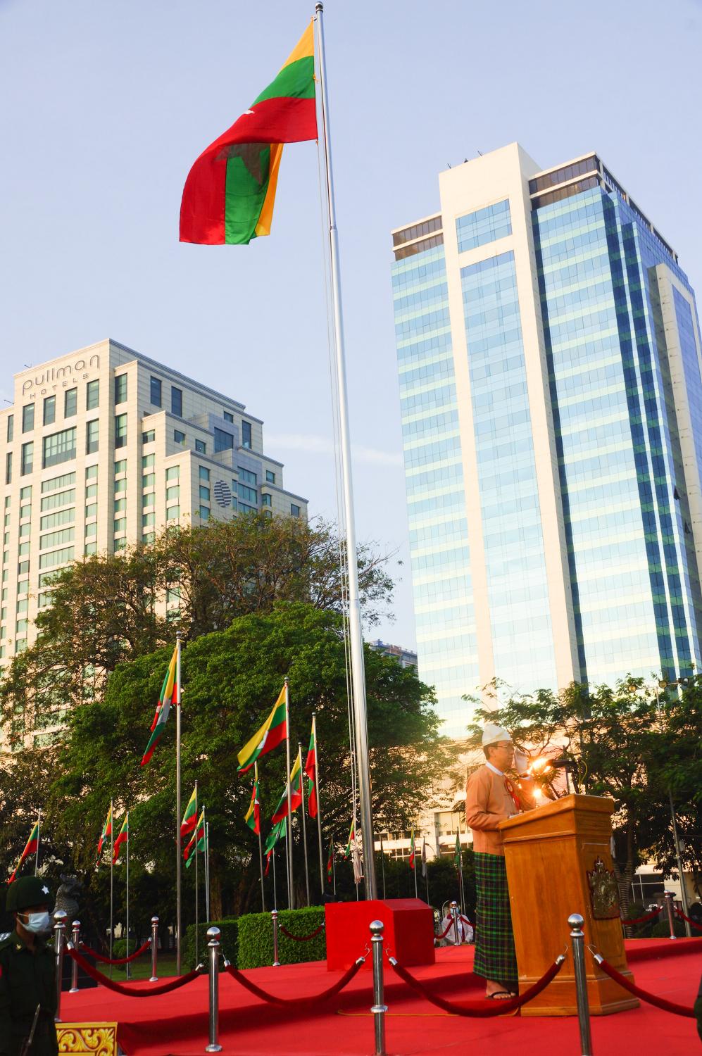 (၇၃)နှစ်မြောက် လွတ်လပ်ရေးနေ့ အလံတင်အခမ်းအနားကို ဂုဏ်ပြုတပ်ဖွဲ့ဖြင့် နိုင်ငံတော်အလံအားကြိုဆိုလွှင့်ထူးခဲ့ပြီး ပြည်ထောင်စု သမ္မတ မြန်မာနိုင်ငံတော်၊ နိုင်ငံတော်သမ္မတ ဦးဝင်းမြင့်ထံမှပေးပို့သော(၇၃)နှစ်မြောက်လွတ်လပ်ရေးနေ့ သဝဏ်လွှာ ကို ရန်ကုန်တိုင်းဒေသကြီးအစိုးရအဖွဲ့ဝန်ကြီးချုပ် ဦးဖြိုးမင်းသိန်းက ဖတ်ကြားခဲ့သည်။