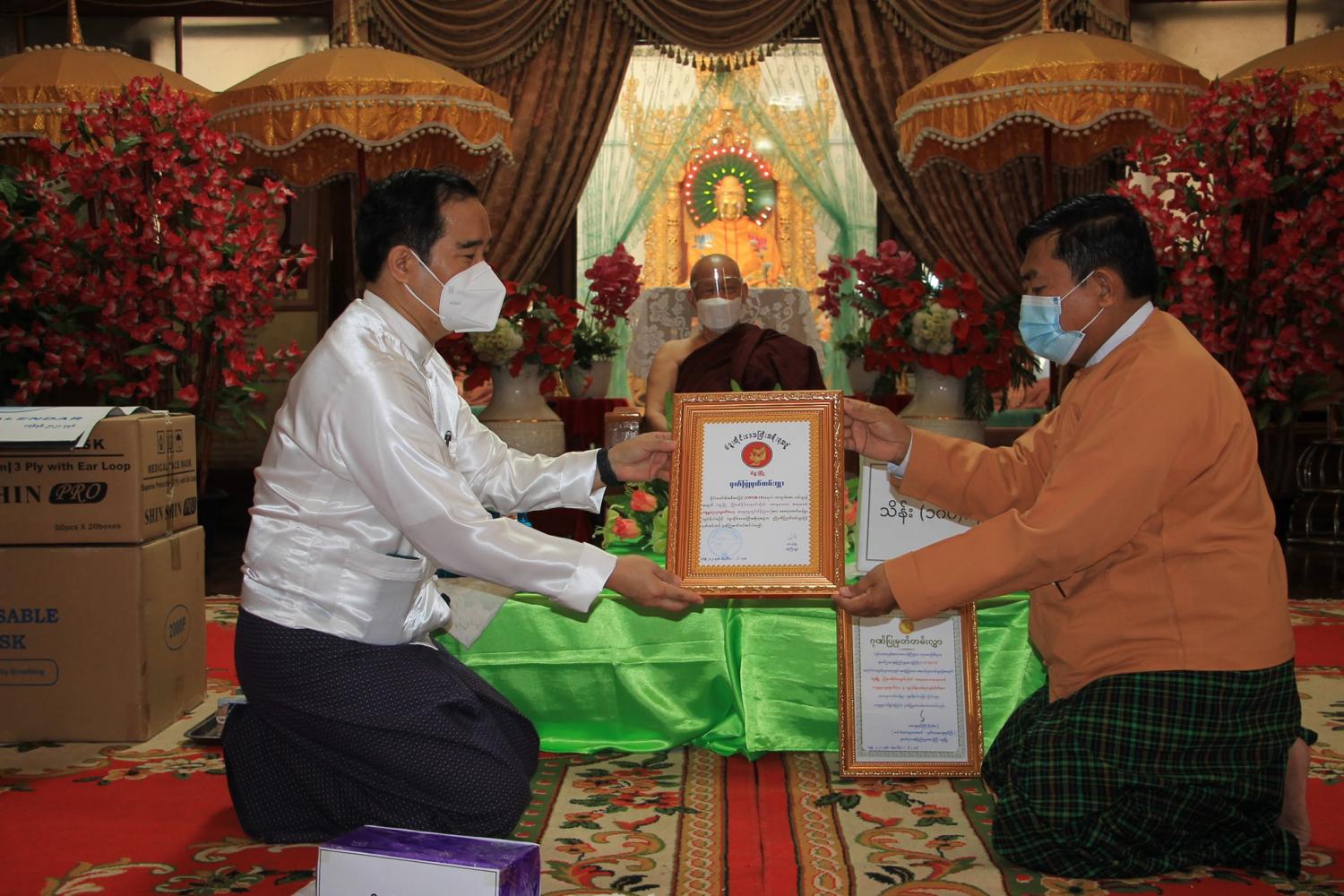 ထို့နောက် သီရိမင်္ဂလာကြခတ်ဝိုင်းပရိယတ္တိစာသင်တိုက် ပဓာနနာယကဆရာတော် ဘဒ္ဒန္တဉေယျ ဓမ္မာဘိဝံသမှ ကိုဗစ်-၁၉ ရောဂါ ကာကွယ်ဆေးဝယ်ယူနိုင်ရေး အတွက် အလှူငွေကျပ်သိန်း (၃၀၀)နှင့် ပဲခူးမြို့အထွေထွေရောဂါ ကုဆေးရုံကြီးတွင် အရေးပေါ်ဆေးဝါးများ ဝယ်ယူနိုင်ရေး အတွက် အလှူငွေကျပ်သိန်း(၁၀၀)တို့အား ပေးအပ်လှူဒါန်းရာ ပဲခူးတိုင်းဒေသကြီးဝန်ကြီးချုပ် ဦးဝင်းသိန်းနှင့် တိုင်းဒေသကြီးပြည်သူ့ကျန်းမာရေးနှင့် ကုသရေးဦးစီးဌာနမှူး၊ ပဲခူးဆေးရုံအုပ်ကြီး ဒေါက်တာရန်နိုင်မောင်တို့က လက်ခံရယူပြီး ဂုဏ်ပြုမှတ်တမ်း ပြန်လည်ပေးအပ်ကာ ပဲခူးတိုင်း ဒေသကြီးဝန်ကြီးချုပ် ဦးဝင်းသိန်းမှ ကျန်းမာရေးအထောက်အကူပစ္စည်းများအား ဆရာတော်ကြီး ထံ ပေးအပ်လှူဒါန်းခဲ့ကြောင်း သိရှိရသည်။