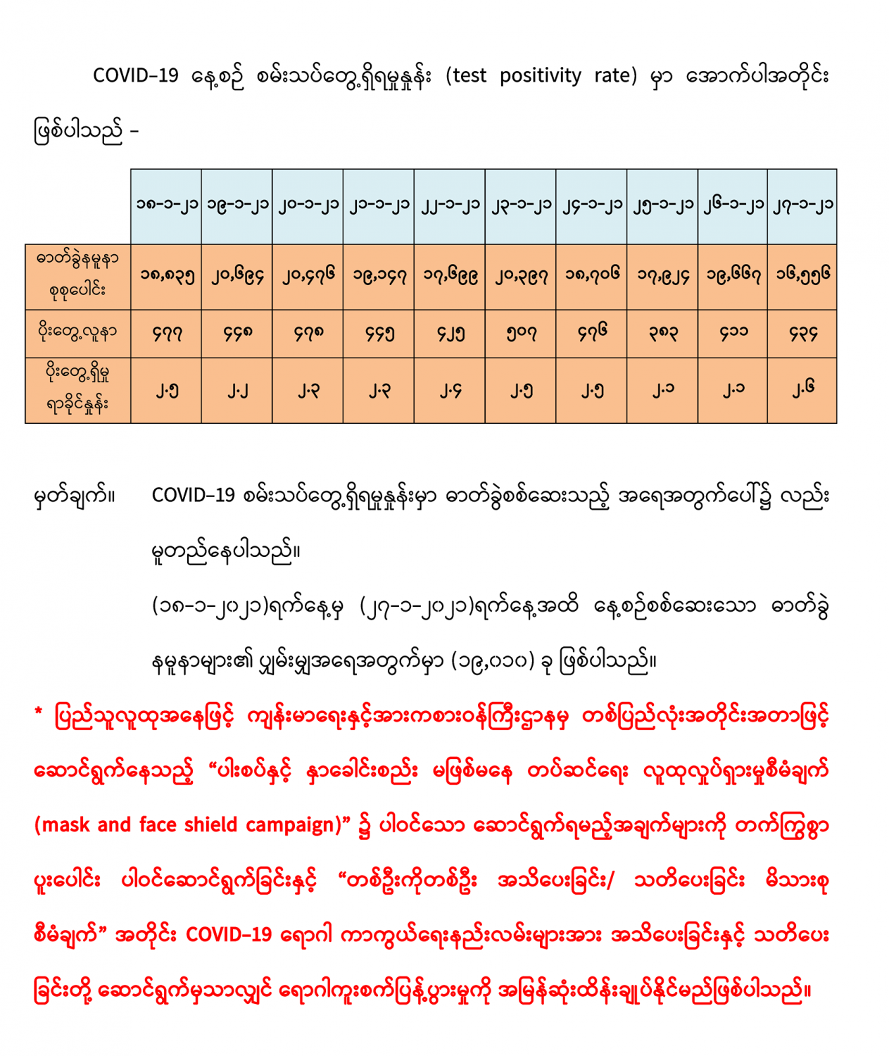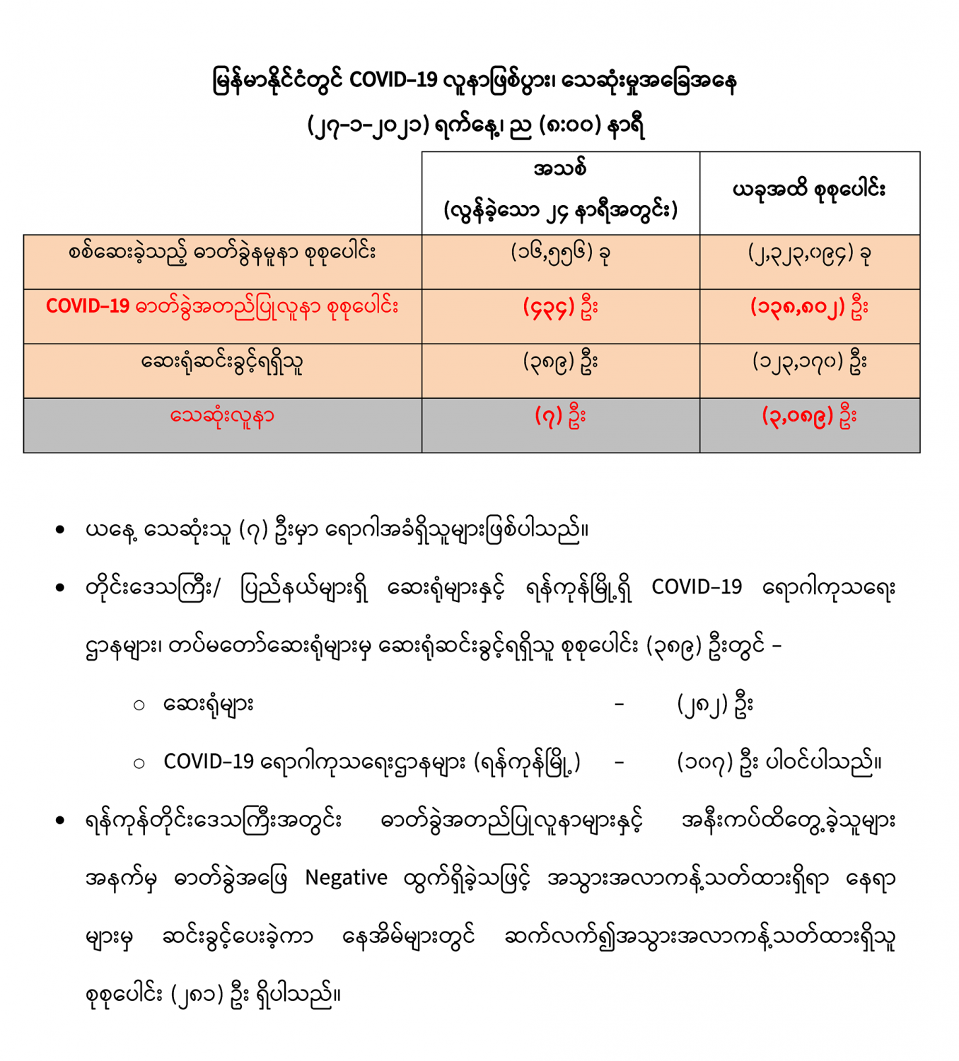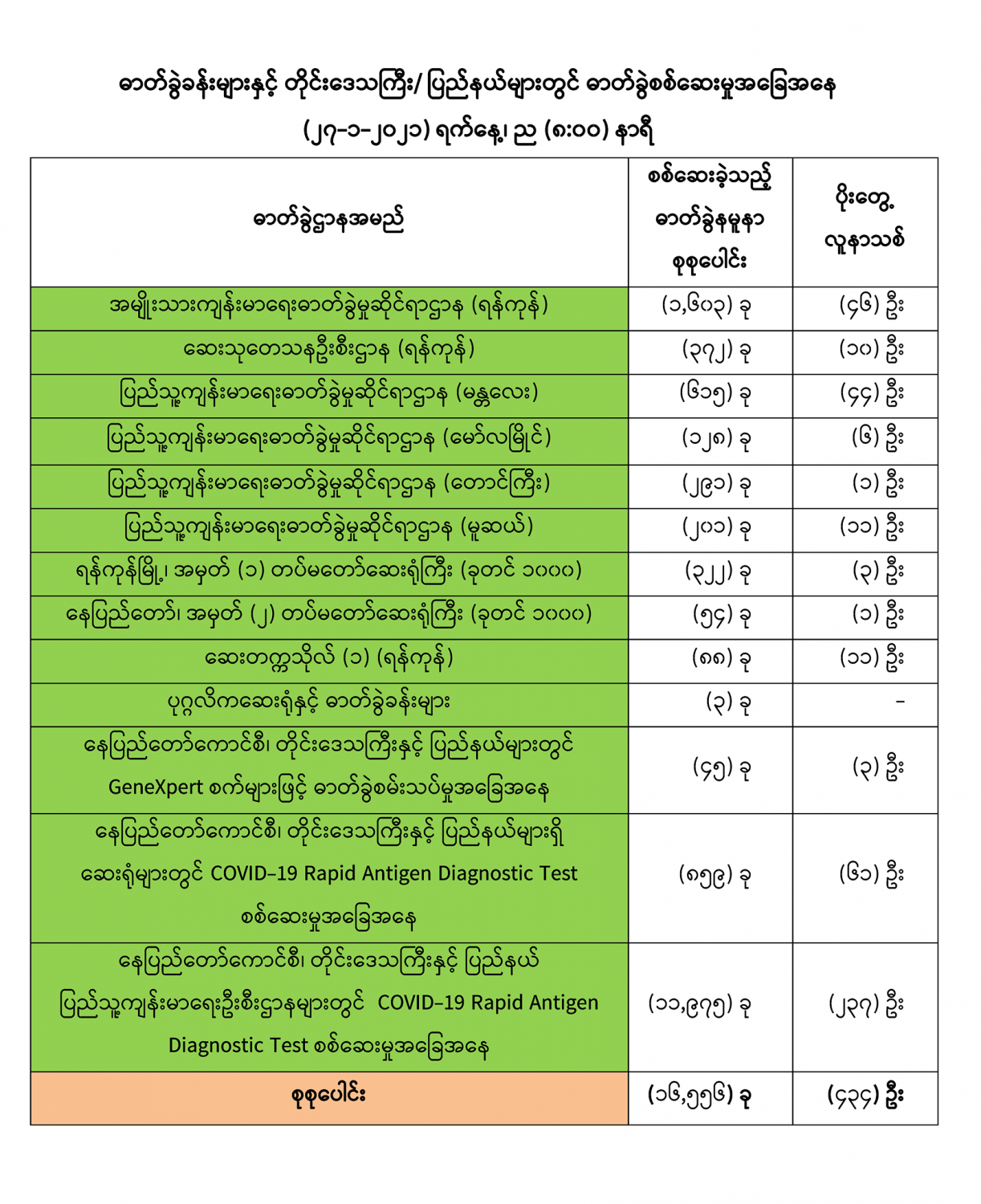 COVID-19 ရောဂါစောင့်ကြပ်ကြည့်ရှုမှုနှင့်ပတ်သက်၍ သတင်းထုတ်ပြန်ခြင်း (၂၇-၁-၂၀၂၁) ရက်နေ့၊ ည (၈:၀၀)နာရီ 01/27/2021 (၂၆-၁-၂၀၂၁)ရက်နေ့၊ ည (၈:၀၀)နာရီမှ (၂၇-၁-၂၀၂၁)ရက်နေ့၊ ည (၈:၀၀)နာရီအတွင်း ဓာတ်ခွဲနမူနာ စုစုပေါင်း (၁၆,၅၅၆)ခုအားစစ်ဆေးပြီးစီးခဲ့ရာ COVID-19 ရောဂါ ာတ်ခွဲအတည် ပြု လူနာသစ် (၄၃၄) ဦး တွေ့ရှိရပါသည်။ #Ministry_of_Health_and_Sports, #MoHS, #COVID19LabResults,
