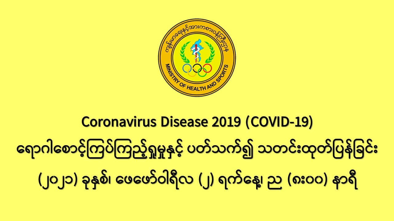 COVID-19 ရောဂါစောင့်ကြပ်ကြည့်ရှုမှုနှင့်ပတ်သက်၍ သတင်းထုတ်ပြန်ခြင်း 02/26/2021 (၂-၂-၂၀၂၁) ရက်နေ့၊ ည (၈:၀၀)နာရီ (၁-၂-၂၀၂၁)ရက်နေ့၊ ည (၈:၀၀)နာရီမှ (၂-၂-၂၀၂၁)ရက်နေ့၊ ည (၈:၀၀)နာရီအတွင်း ဓာတ်ခွဲ နမူနာ စုစုပေါင်း (၁၂,၃၇၇)ခု အား စစ်ဆေးပြီးစီးခဲ့ရာ COVID-19 ရောဂါ ဓာတ်ခွဲအတည်ပြုလူနာသစ် (၃၁၀) ဦး တွေ့ရှိရပါသည်။ #Ministry_of_Health_and_Sports, #MoHS, #COVID19LabResults, #ကိုရိုနာဗိုင်းရပ်စ်, #ဓာတ်ခွဲအဖြေ https://www.mohs.gov.mm/