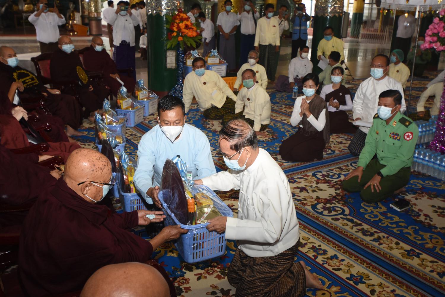 အခမ်းအနားများသို့ နိုင်ငံတော်သံဃမဟာနာယကအဖွဲ့၊ အကျိုးတော်ဆောင်သန်လျင်မင်းကျောင်း ပရိယတ္တိစာသင်တိုက် ဦးစီးပဓါနနာယကဆရာတော် အဂ္ဂမဟာပဏ္ဍိတ၊ အဂ္ဂမဟာ သဒ္ဓမ္မဇောတိကဓဇ ဒေါက်တာဘဒ္ဒန္တစန္ဒိမာဘိဝံသ အမှူးပြုသော နိုင်ငံတော်သံဃမဟာ နာယကအဖွဲ့ ဆရာတော်ကြီးများ၊ ရွှေတိဂုံစေတီတော်ဂေါပကအဖွဲ့၏ သြဝါဒါစရိယ ဆရာတော်ကြီးများ ကြွရောက်တော်မူကြပြီး နိုင်ငံတော်သံဃမဟာနာယကအဖွဲ့ အကျိုးတော်ဆောင် ဆရာတော် အဂ္ဂမဟာပဏ္ဍိတ၊ အဂ္ဂမဟာ သဒ္ဓမ္မဇောတိကဓဇ ဒေါက်တာဘဒ္ဒန္တ စန္ဒိမာဘိဝံသ ဆရာတော်ကြီးထံမှ ဧည့်ပရိသတ်များက ငါးပါးသီလ ခံယူဆောက်တည်၍ နိုင်ငံတော် သြဝါဒါစရိယ ရွှေတိဂုံစေတီတော်ဂေါပကအဖွဲ့၏ သြဝါဒါစရိယဆရာတော် အဂ္ဂမဟာပဏ္ဍိတ ဘဒ္ဒန္တတိလောကာ ဘိဝံသထံမှ အနုမောဒနာတရားနာယူကာ လှူဖွယ်ဝတ္ထုပစ္စည်းများ ဆက်ကပ် လှူဒါန်းသည်။