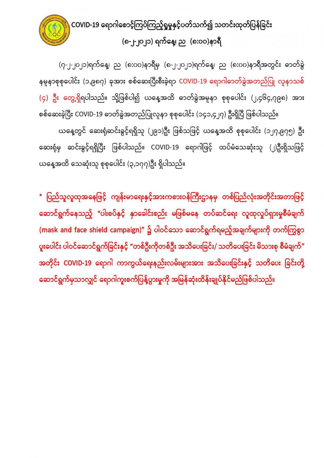 Covid-19 ရောဂါစောင့်ကြပ်ကြည့်ရှုမှုနှင့်ပတ်သက်၍ သတင်းထုတ်ပြန်ခြင်း (၈-၂-၂၀၂၁) ရက်နေ့၊ ည (၈:၀၀)နာရီ 02/08/2021