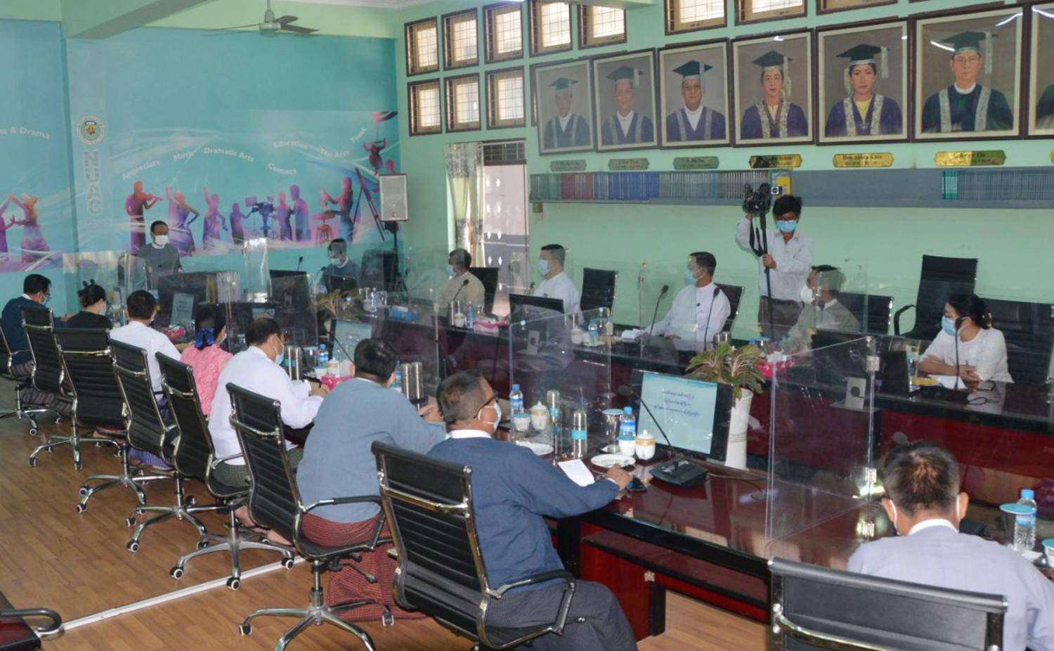 ယင်းနောက် ပြည်ထောင်စုဝန်ကြီးနှင့်အဖွဲ့သည် မွန်းတည့်(၁၂)နာရီတွင် ရန်ကုန်တိုင်း ဒေသကြီး၊ ဒဂုံမြို့သစ် (တောင်ပိုင်း) မြို့နယ်ရှိ အမျိုးသားယဉ်ကျေးမှုနှင့်အနုပညာ တက္ကသိုလ် (ရန်ကုန်)သို့ရောက်ရှိပြီး ပါမောက္ခချုပ်၊ ဒုတိယ ပါမောက္ခချုပ်များ၊ ပါမောက္ခ/ဌာနမှူးများ၊ တွဲဖက်ပါမောက္ခများနှင့် စွယ်တော်ဆောင် အစည်းအဝေးခန်းမတွင် တွေ့ဆုံသည်။