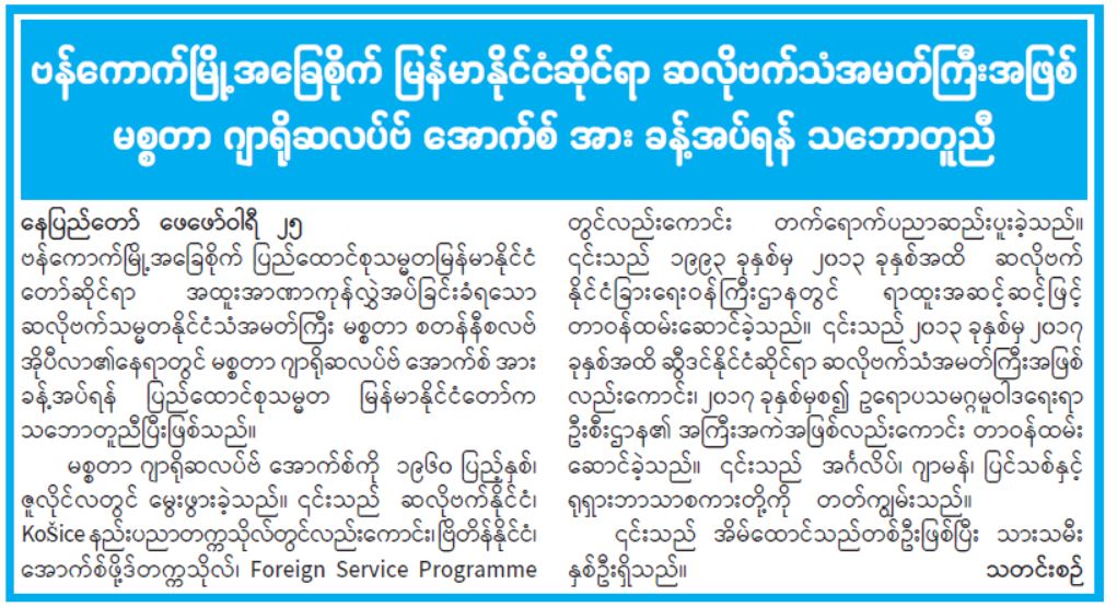 ဗန်ကောက်မြို့အခြေစိုက် မြန်မာနိုင်ငံဆိုင်ရာ ဆလိုဗက်သံအမတ်ကြီးအဖြစ် မစ္စတာ ဂျာရိုဆလပ်ဗ် အောက်စ် အားခန့်အပ်ရန်သဘောတူညီ 02/25/2021