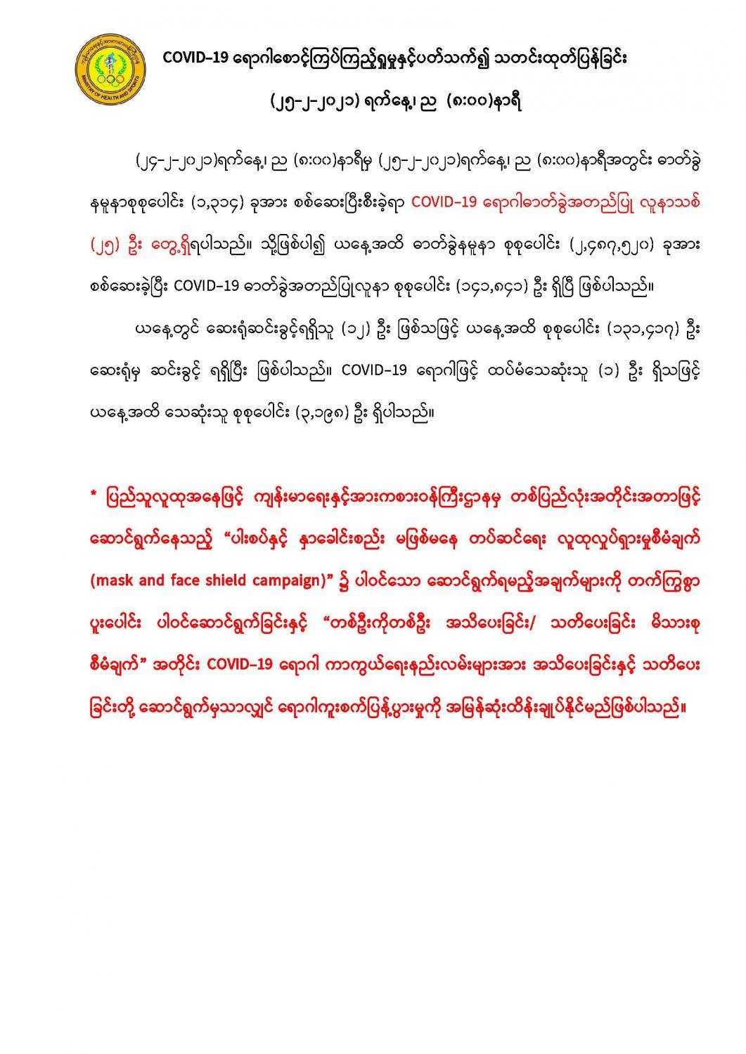 COVID-19 ရောဂါစောင့်ကြပ်ကြည့်ရှုမှုနှင့်ပတ်သက်၍ သတင်းထုတ်ပြန်ခြင်း (25-2-2021, 8:00 PM) 02/25/2021 နေပြည်တော်