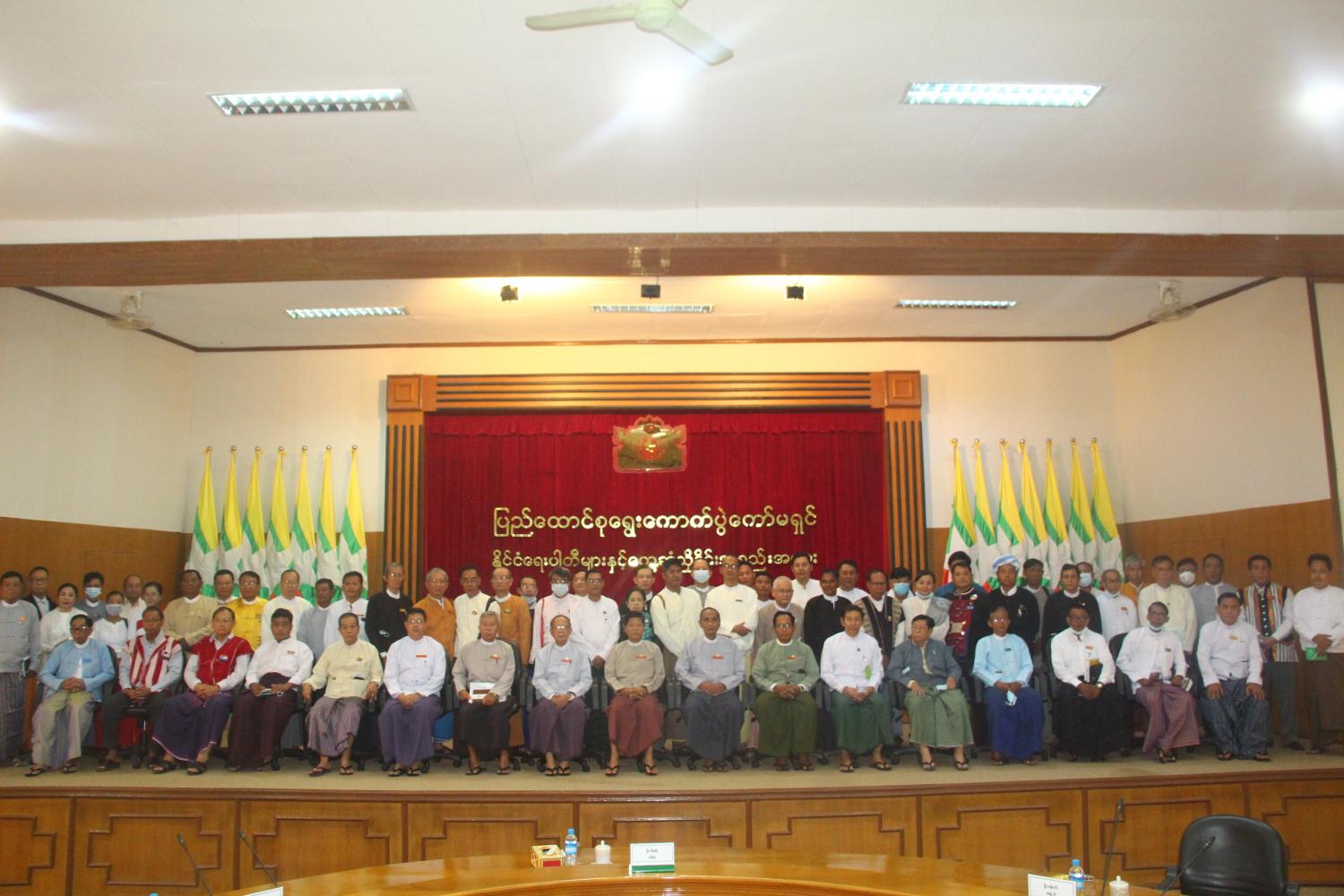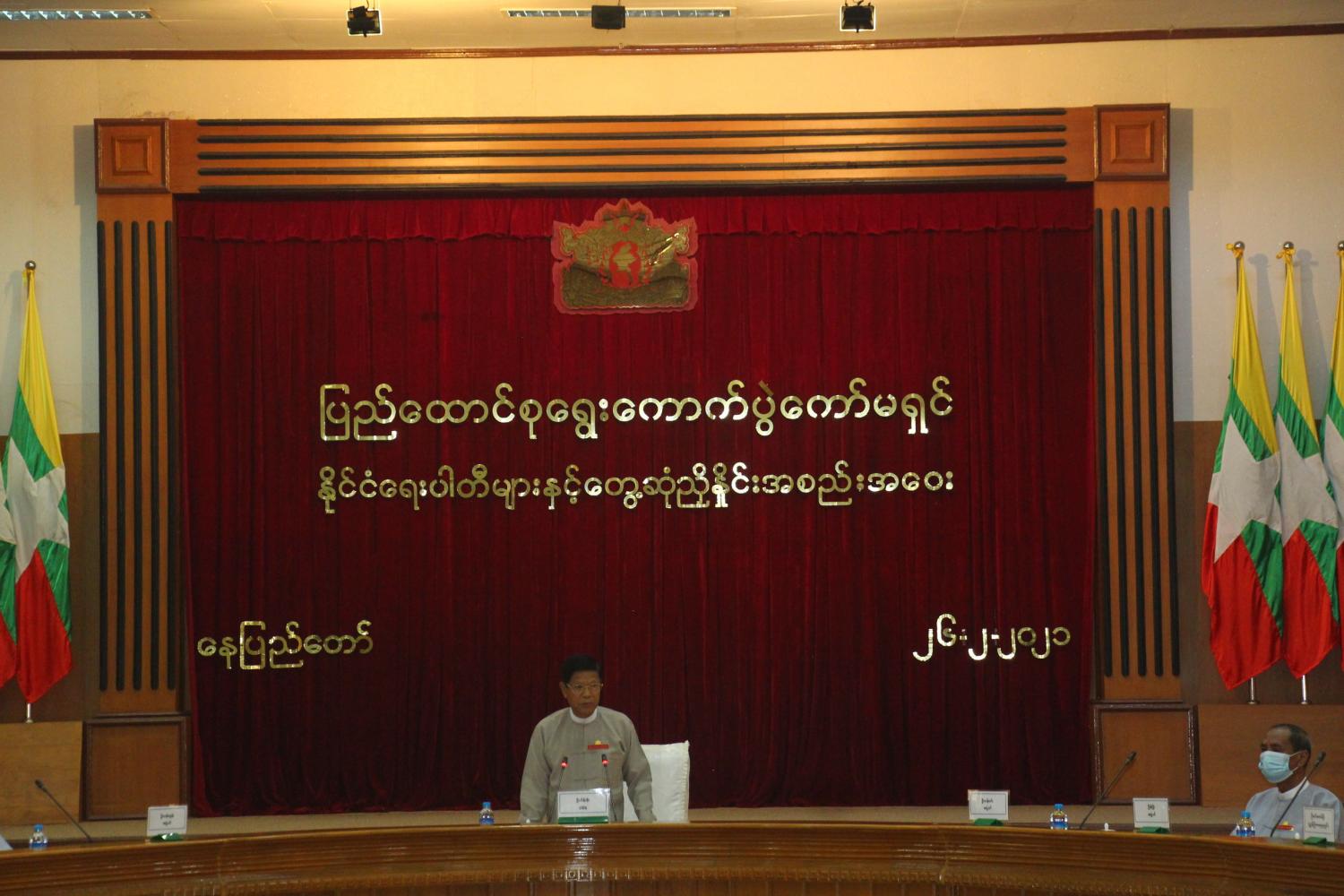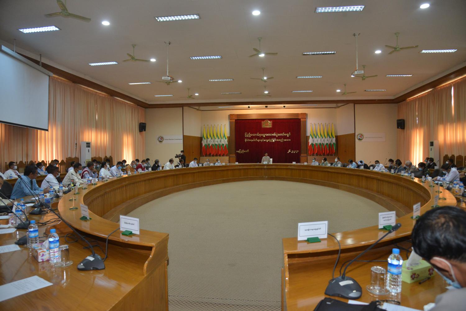 အစည်းအဝေးတွင် ပြည်ထောင်စုရွေးကောက်ပွဲကော်မရှင်ဥက္ကဋ္ဌက ၂၀၀၈ ခုနှစ် ဖွဲ့စည်းပုံအခြေခံ ဥပဒေပုဒ်မ ၄၁၇ အရ ဖေဖော်ဝါရီ ၁ ရက်တွင် နိုင်ငံတော်ကို အရေးပေါ်အခြေအနေသတ်မှတ်ပြီး ပုဒ်မ ၄၁၈(က)အရဥပဒေပြုရေး၊ အုပ်ချုပ်ရေးနှင့် တရားစီရင်ရေး အာဏာတို့ကို တပ်မတော်ကာကွယ်ရေး ဦးစီးချုပ်ထံသို့ ယာယီသမ္မတက လွှဲအပ်ခဲ့ပါကြောင်း၊ ယင်းသို့ လွှဲအပ်သည့်နေ့မှစ၍ လွှတ်တော်အားလုံး နှင့် ဦးစီးအဖွဲ့များ၏ ဥပဒေပြုရေးဆိုင်ရာလုပ်ငန်းများ ရပ်ဆိုင်းထားရမည်ဟု မှတ်ယူရမည့်အပြင် လွှတ်တော်များ၏ သက်တမ်းကုန်ဆုံးသည့်အခါ သက်ဆိုင်ရာလွှတ်တော်များသည် အလိုအလျောက် ဖျက်သိမ်းပြီးဖြစ်သည်ဟု မှတ်ယူရမည်ဖြစ်ကြောင်း၊ ထိုသို့ တပ်မတော်ကာကွယ်ရေးဦးစီးချုပ်ထံ နိုင်ငံတော်အာဏာ ၃ ရပ်ကို လွှဲအပ်ပြီးနောက် တပ်မတော်ကာကွယ်ရေးဦးစီးချုပ်ရုံးက နိုင်ငံတော်စီမံ အုပ်ချုပ်ရေးကောင်စီကိုဖွဲ့စည်းခဲ့ပြီး နိုင်ငံတော်စီမံအုပ်ချုပ်ရေးကောင်စီက ပြည်ထောင်စုရွေးကောက်ပွဲ ကော်မရှင်ကို ဖွဲ့စည်းတာဝန်ပေးအပ်ခဲ့ပါကြောင်း၊ နိုင်ငံတော်စီမံ အုပ်ချုပ်ရေးကောင်စီက ချမှတ်ထား သည့် ရှေ့လုပ်ငန်းစဉ် ၅ ရပ်အနက် ပထမလုပ်ငန်းစဉ်ကို အကောင်အထည်ဖော် ဆောင်ရွက်ရာတွင် ပြည်ထောင်စုရွေးကောက်ပွဲကော်မရှင်အနေဖြင့် ဖေဖော်ဝါရီ ၅ ရက်မှစ၍ ၂၀၂၀ ပြည့်နှစ် အထွေထွေ ရွေးကောက်ပွဲတွင် ပေါ်ပေါက်ခဲ့သည့် မဲမသမာမှုများနှင့်စပ်လျဉ်းပြီး လိုအပ်သည့် စုံစမ်းစစ်ဆေးမှုများကို စတင်ပြုလုပ်လျက်ရှိပါကြောင်း။
