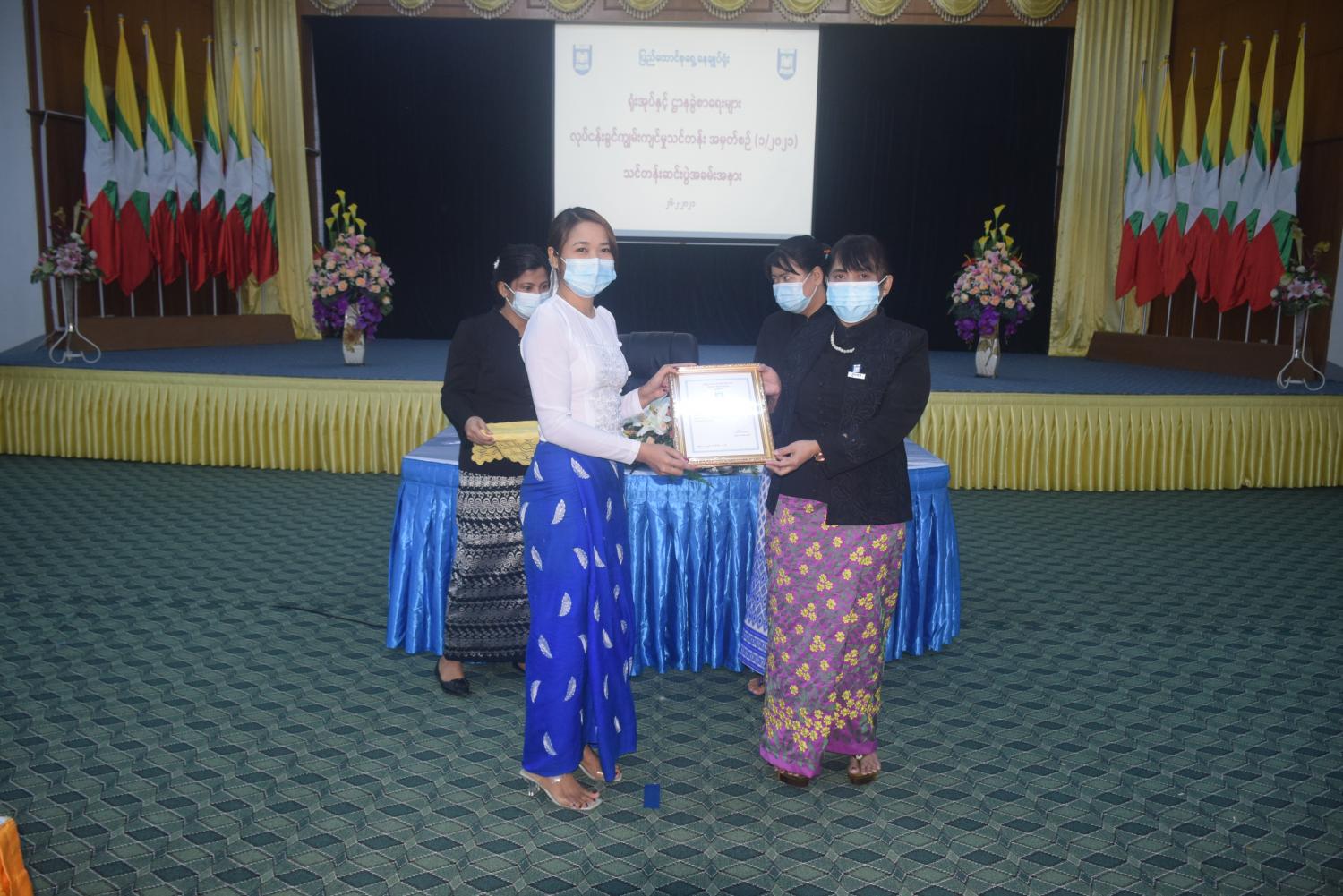 ထို့နောက် သင်တန်းမှူး ဒုတိယညွှန်ကြားရေးမှူး ဒေါ်စန္ဒာလွင်က သင်တန်းဆင်း အစီရင်ခံစာအား ဖတ်ကြားရှင်းလင်းတင်ပြကာ ပြည်ထောင်စုရှေ့နေချုပ်က သင်တန်းတွင် ဆုရရှိသူအသီးသီးအား ဆုများပေးအပ်ချီးမြှင့်သည်။
