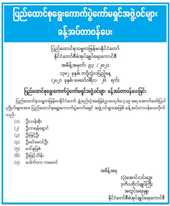 ပြည်ထောင်စုရွေးကောက်ပွဲကော်မရှင်အဖွဲ့ဝင်များ ခန့်အပ်တာဝန်ပေး